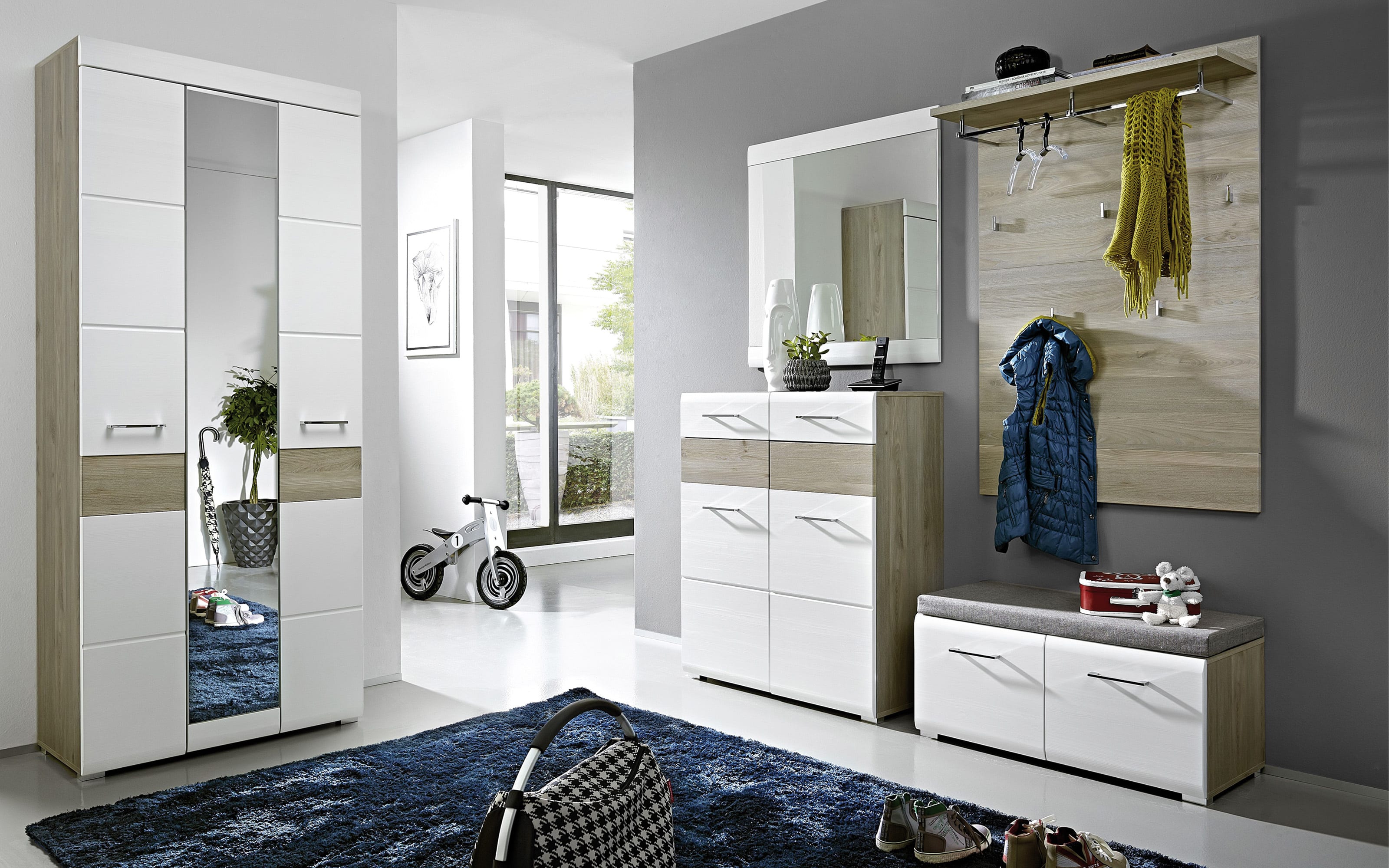 Ausführung in Hochglanz weiß, 2-türig, inklusive Sitzkissen in grau,