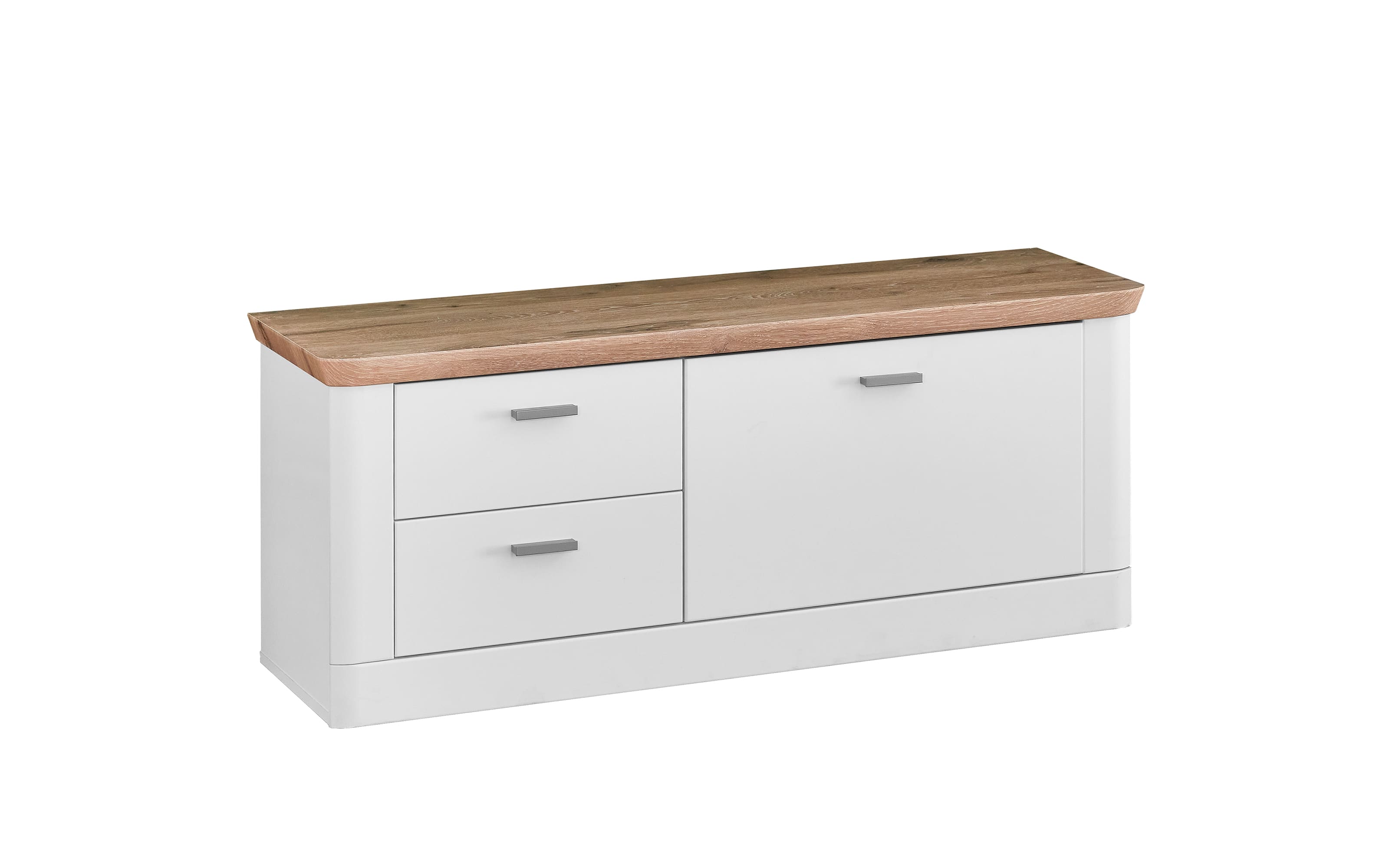 Ausführung mit Front in Weiß matt und Korpus in Weiß, Absetzung in Nox Oak-Nachbildung, Griffe in Nickel, ohne Sitzkissen, 1 Klappfach, 2 Schubkästen,