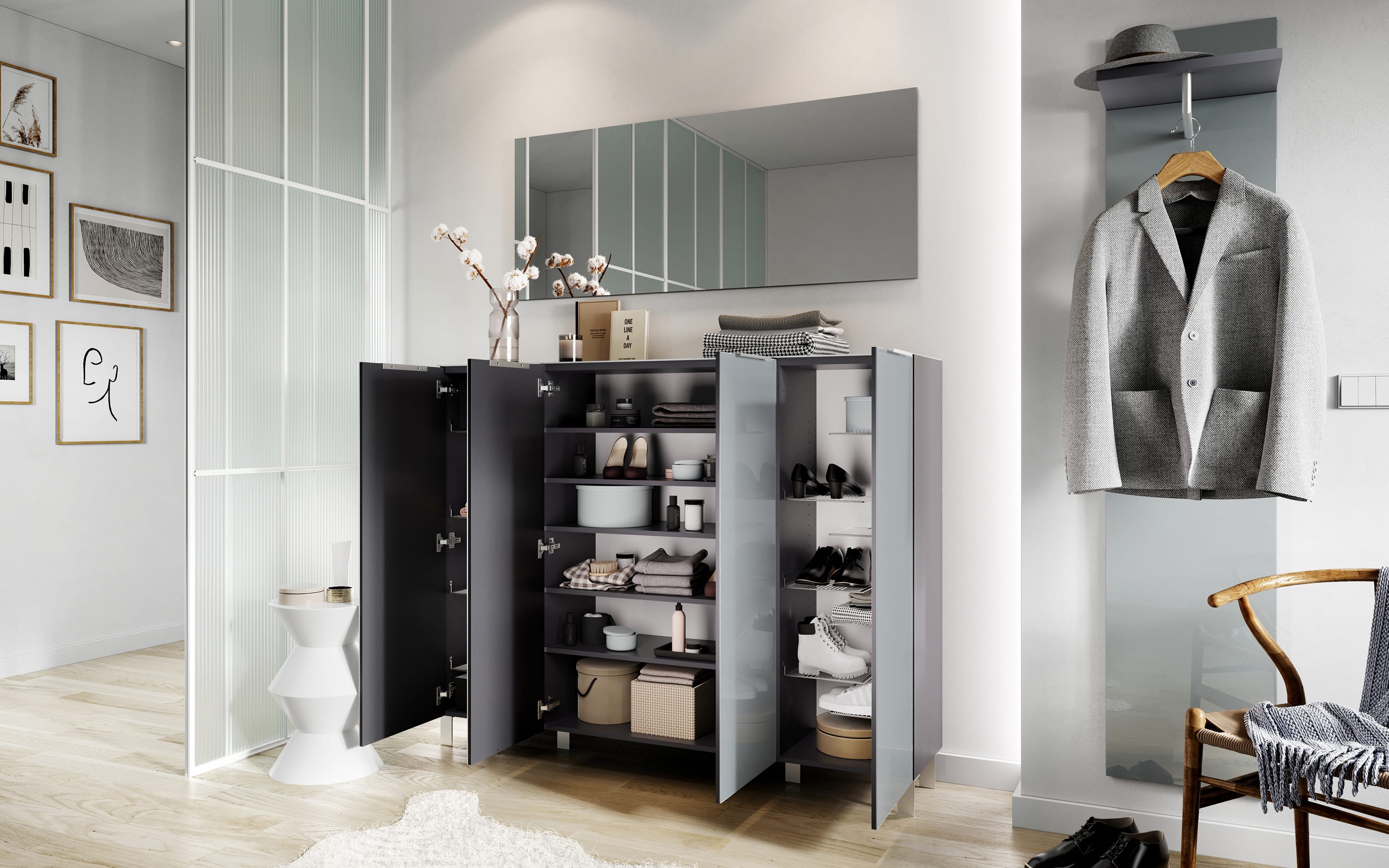 Ausführung mit Korpus aus MDF in graphit, Front aus Glas in grau, 1 Kleiderstange und 4 Haken aus Metall,