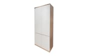Ausführung mit Korpus aus Asteiche und Front in seidengrau lackiert, 2 Türen mit Griffleiste aus Vinylharz, Softclose Funktion, 6 Einlegeböden, 1 ausziehbare Kleiderstange,