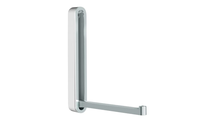 Ausführung aus Zinkdruckguss in matt chromfarbig, Absetzung aus Kunststoff in weiß, praktische Einklappfunktion,