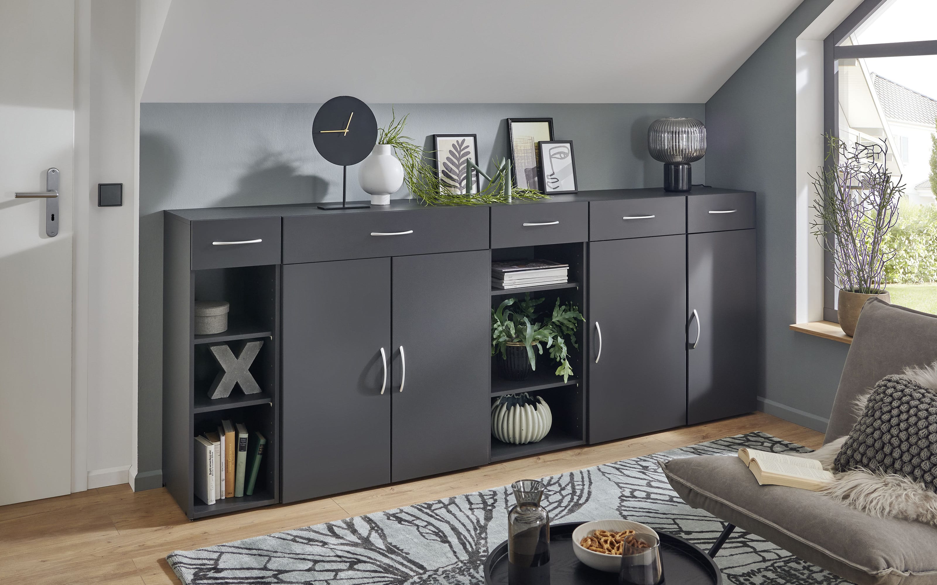 Ausführung mit Front und Korpus in graphit, matt, 1 Schubkasten, 1 Tür, 2 Einlegeböden, mit Multiraumkonzept-Schränken kombinierbar,