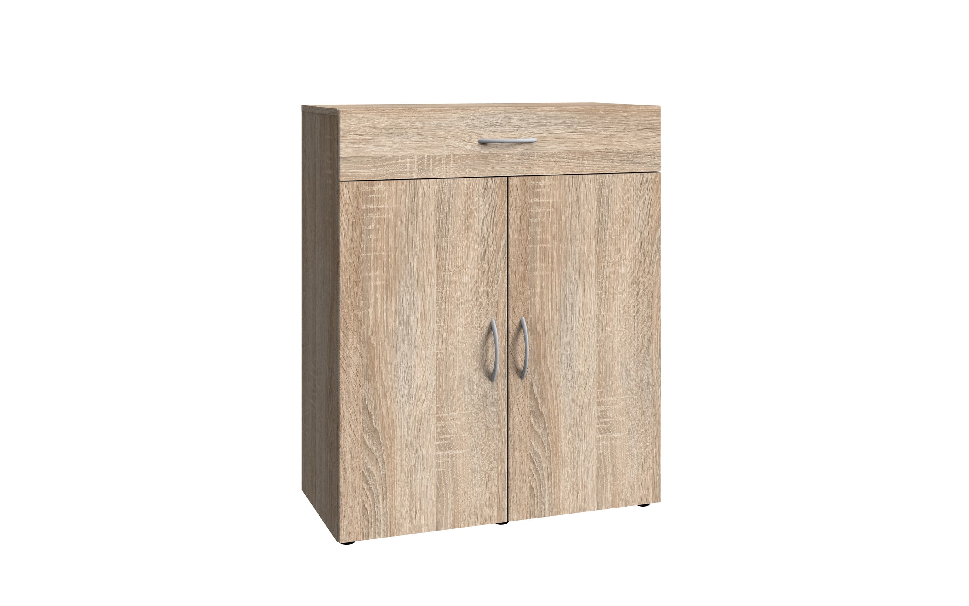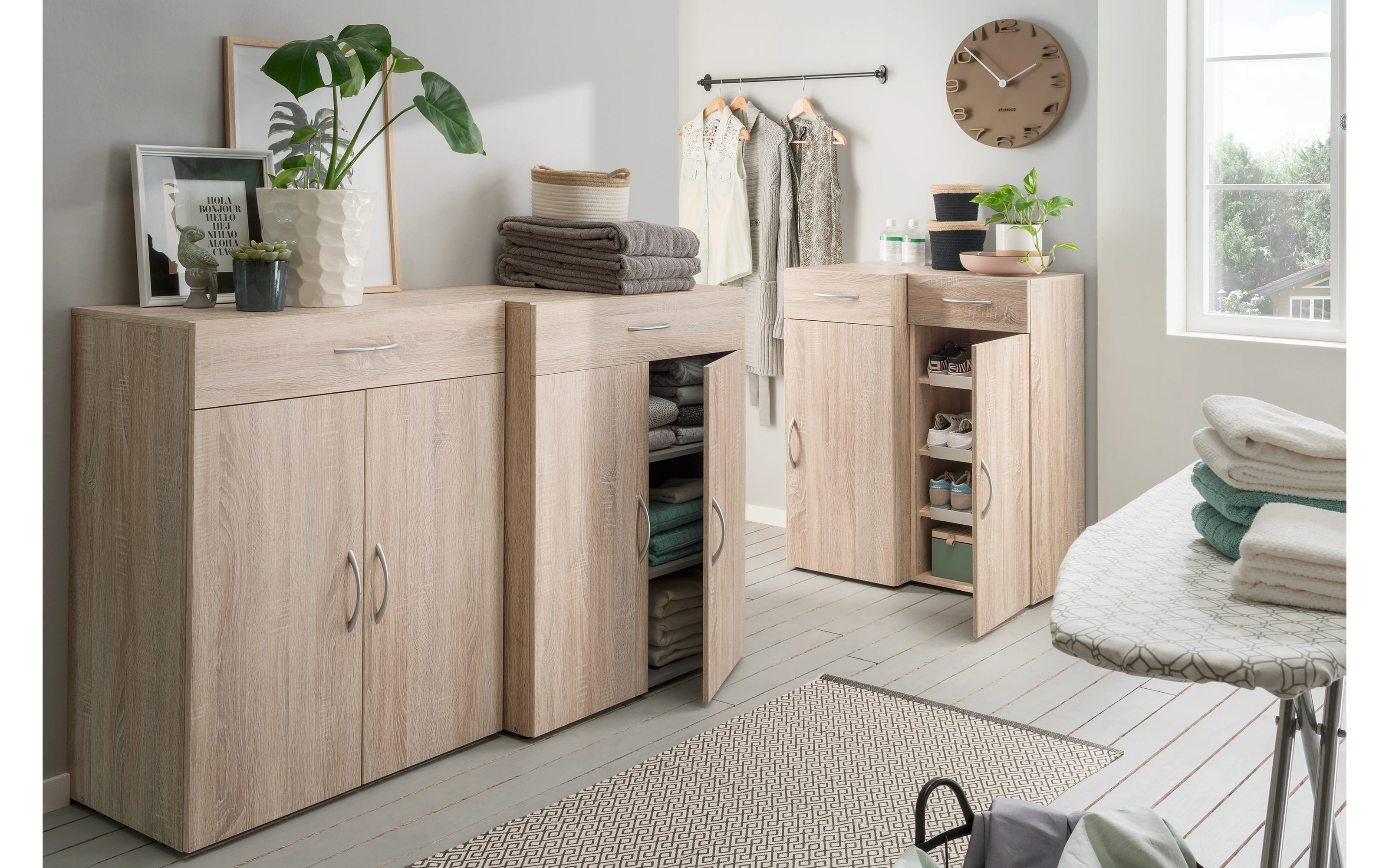 Ausführung mit Front und Korpus in Eiche-Nachbildung, sägerau, 1 Schubkasten, 2 Türen, 2 Einlegeböden, mit Multiraumkonzept-Schränken kombinierbar,