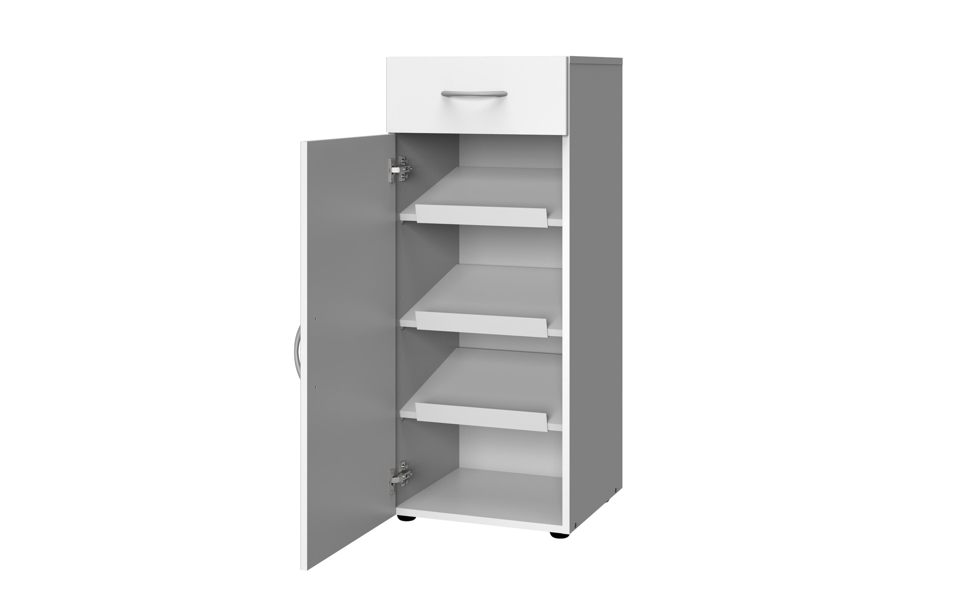 Ausführung mit Front und Korpus in weiß, matt, 1 Tür, 1 Schubkasten, 3 Einlegeböden, Griffe in silberfarbig, mit Multiraumkonzept-Schränken kombinierbar,