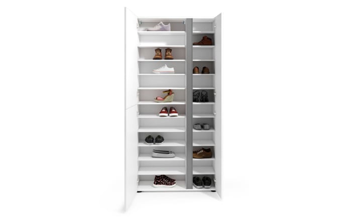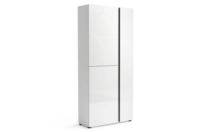 Ausführung mit Korpus und Front in weiß, Absetzungen in grau, Füße aus Kunststoff in schwarz, 2 Türen, 22 Einlegeböden,