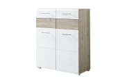Ausführung in Hochglanz weiß mit Absetzung in Silbereiche-Nachbildung, 2 Schranktüren und 2 Schubfächer,