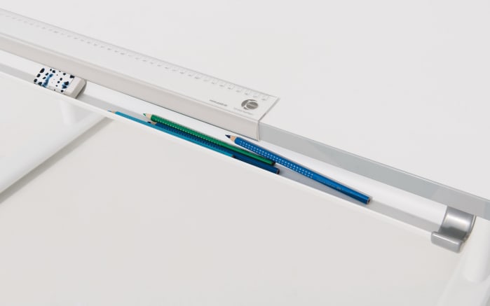 ausgestattet mit ca. 60 cm Lineal, Ablagemulde und Taschenhaken, Gestell in silberfarbig,