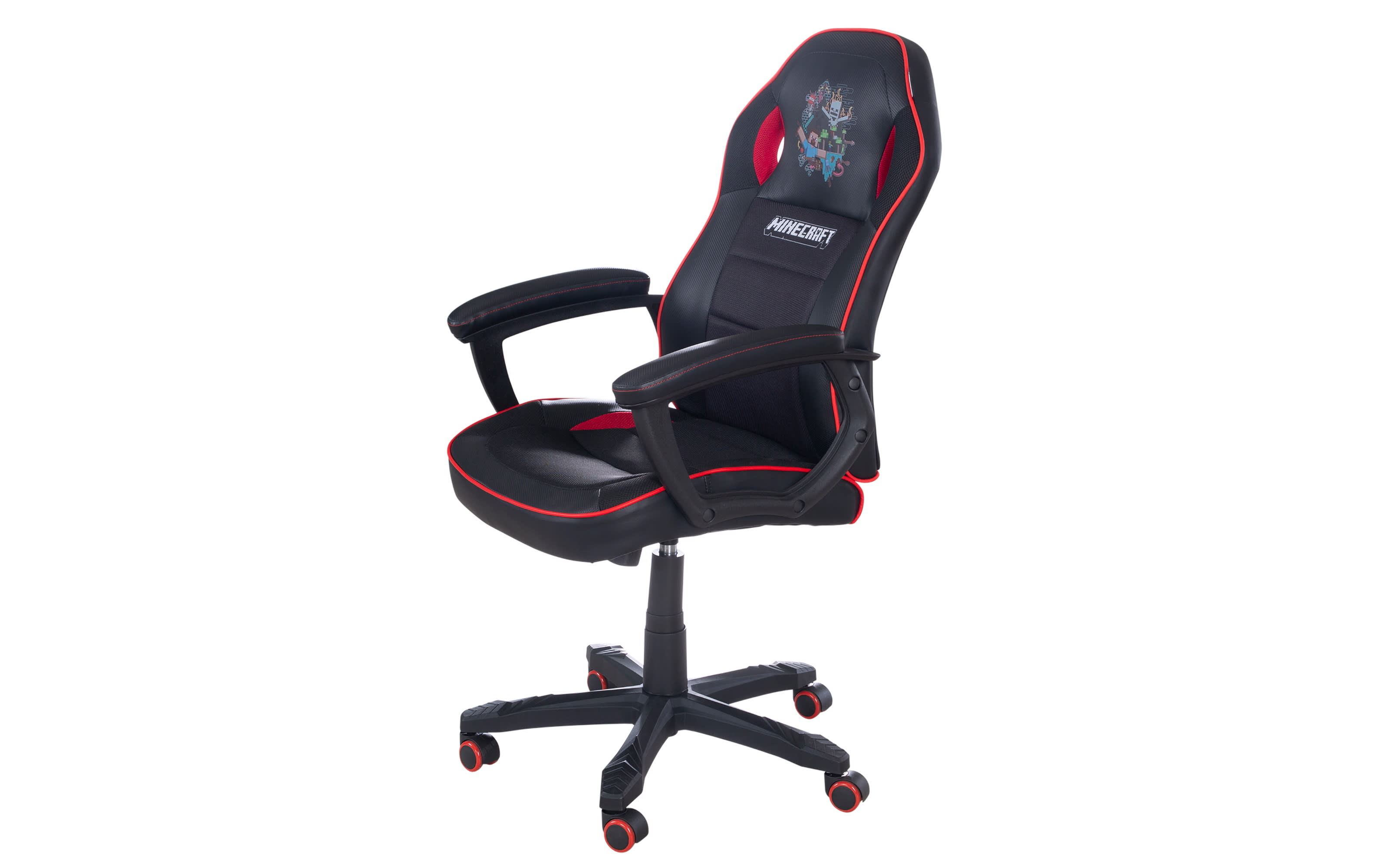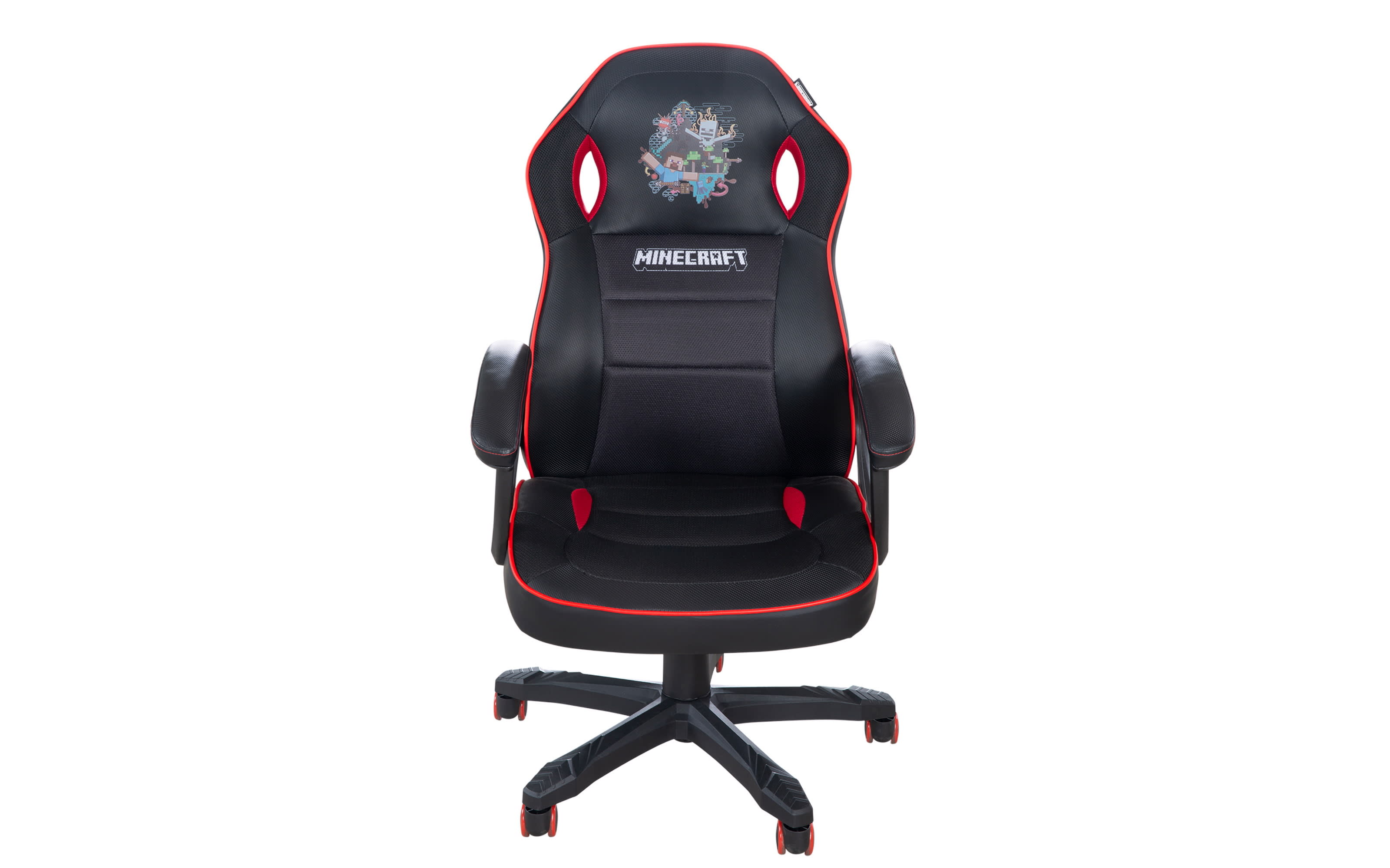 Auf der Kopfstütze ist nicht nur das Minecraft Logo zu sehen, sondern auch die Spielecharaktere Steve und weitere Spieleelemente.