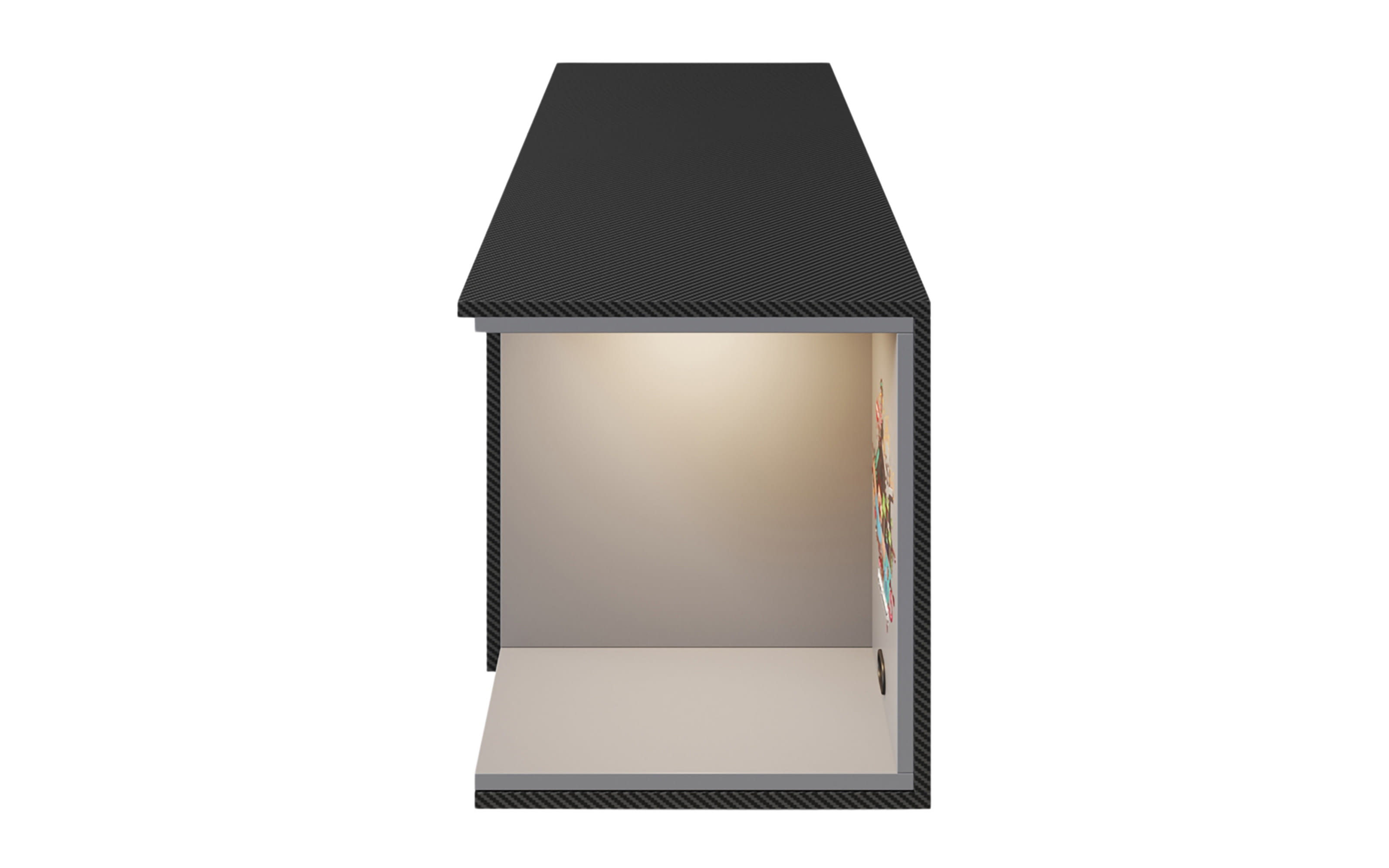 Lowboard mit einer Klappe und einem offenem Konsolenfach in schwarzer Carbon Nachbildung.