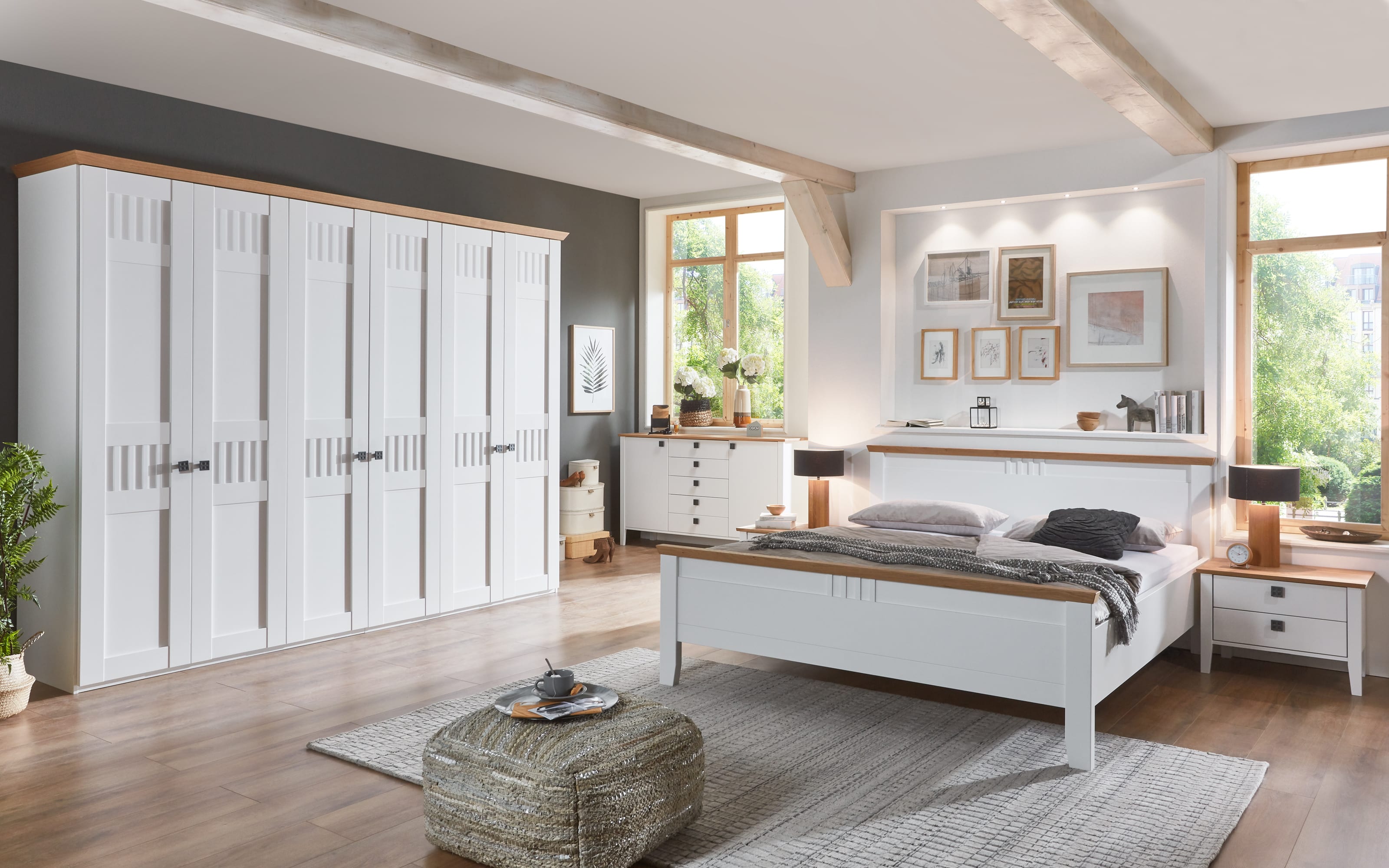 Ausführung Front und Korpus mit hochwertiger Lackoberfläche in weiß, Absetzungen in Wildeiche,