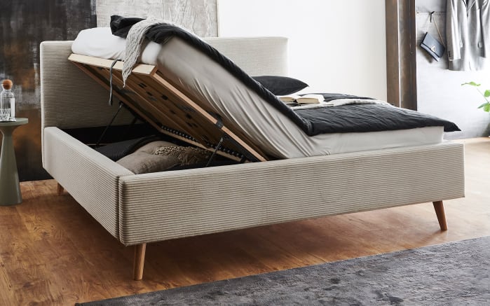 Das sorgt für einen komfortablen Ein- und Ausstieg in das Bett. Der Stoffbezug Poso mit Cord-Charakter in der Farbe beige ziert nicht nur das Kopfteil mit dezenter, sondern auch den Rahmen.