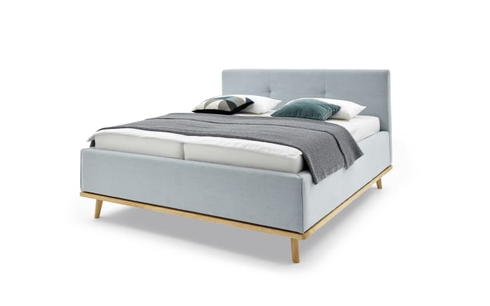 Ausführung in Stoff STONE Eisblau, Fuß und Rahmen eichefarbig massiv, Liegefläche ca. 180 x 200 cm.