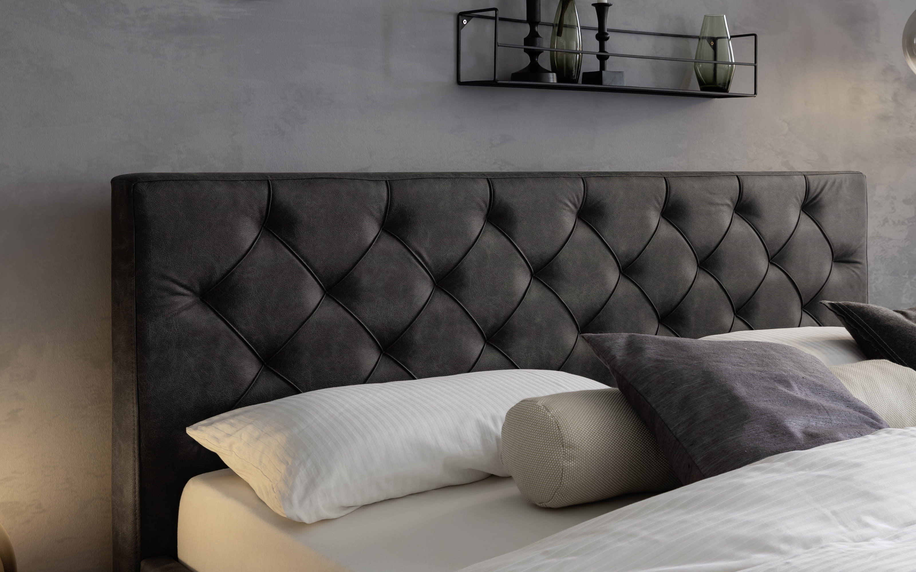 Polsterbett in anthrazit, 7-Zonen-Wendetonnentaschenfederkernmatratzen, eine Seite in Härtegrad 2, zweite Seite in Härtegrad 3,