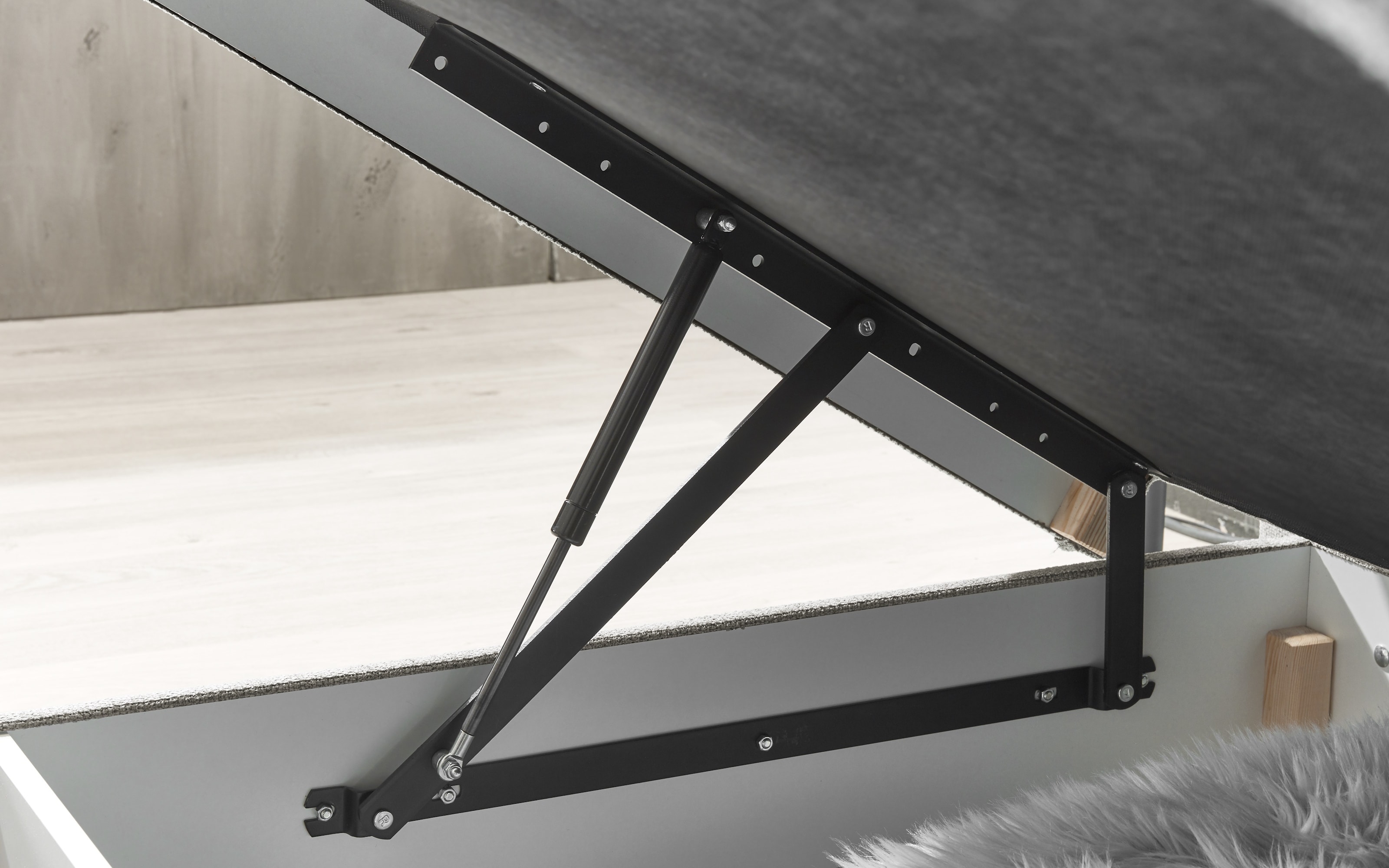 Unterbau mit 4-Gang-Bonellfederkern ist nicht zerlegbar, Kopfteil mit Bettkasten und Kassettenoptik.