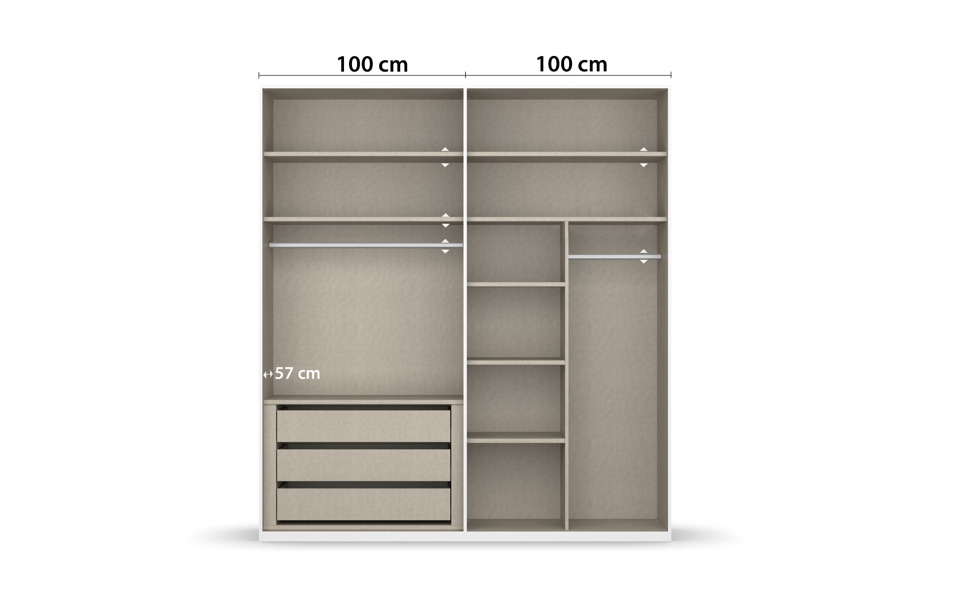 rechtes Element mit 2 breiten Einlegeböden, T-Einteilung mit 3 Einlegeböden kurz, 1 Kleiderstange kurz,