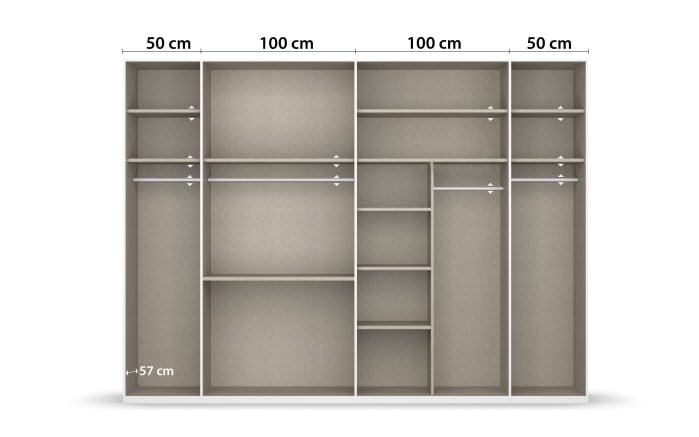 Korpus und Front in alpinweiß, Griffe chromfarbend, 6-türig, davon 2 Spiegeltüren, Inneneinteilung ca. 50/100/100/50 cm,