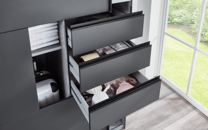 Ausführung Korpus, Front und Schubkästen in graphit, 3-türig, mittlere Tür in Glas schwarz,
