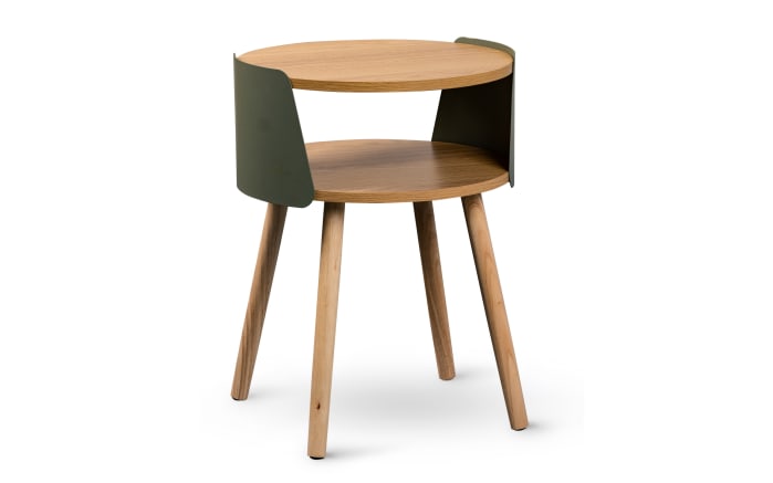 Ausführung der Tischplatte und Ablageplatte in Eiche Nachbildung, Korpus aus Metall in grün, Füße aus Massivholz,