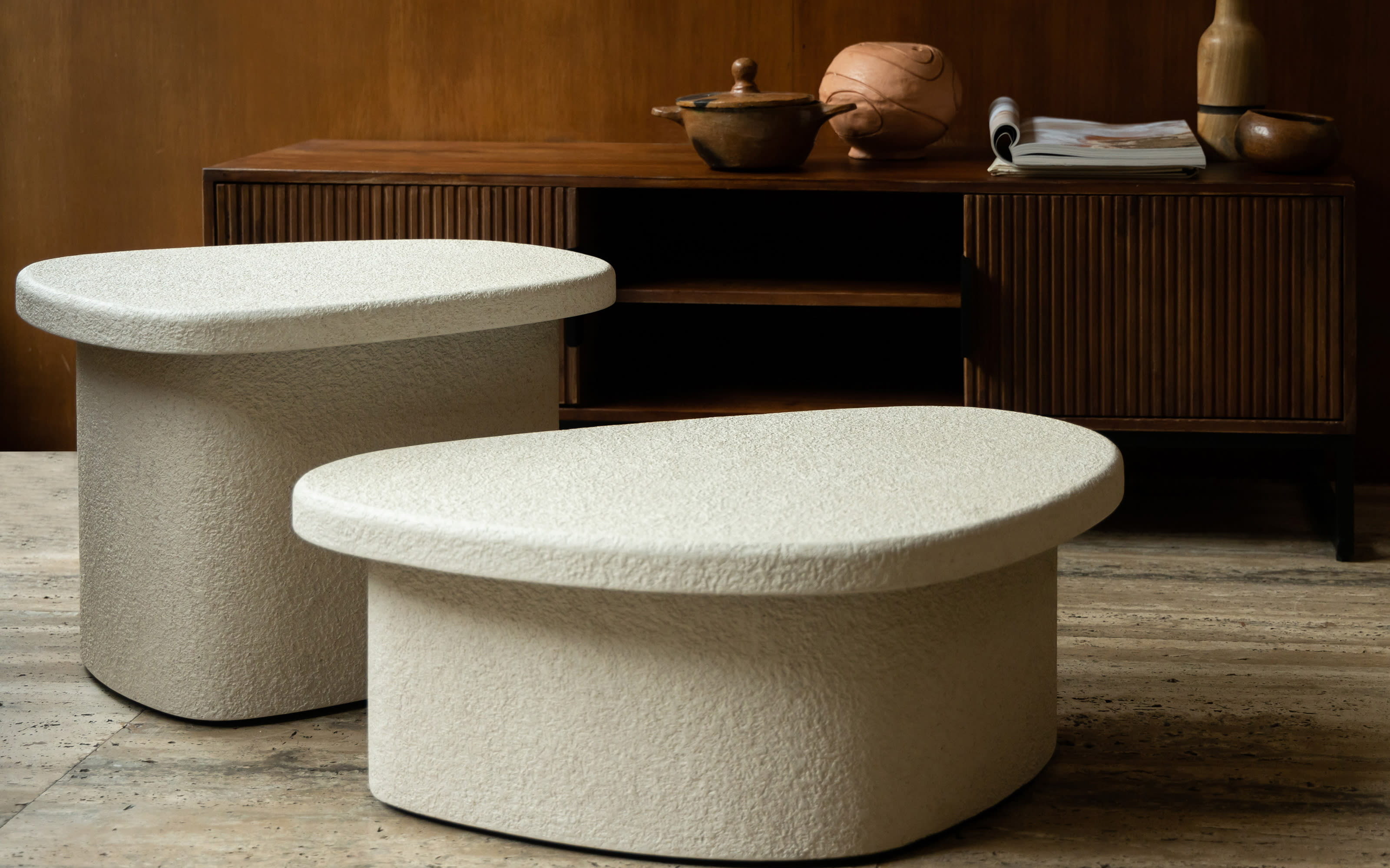 Ausführung aus rerecyceltetem Marmor & MDF plywood shell creme white, B/H/T ca. 45 x 41 x 56 cm.
