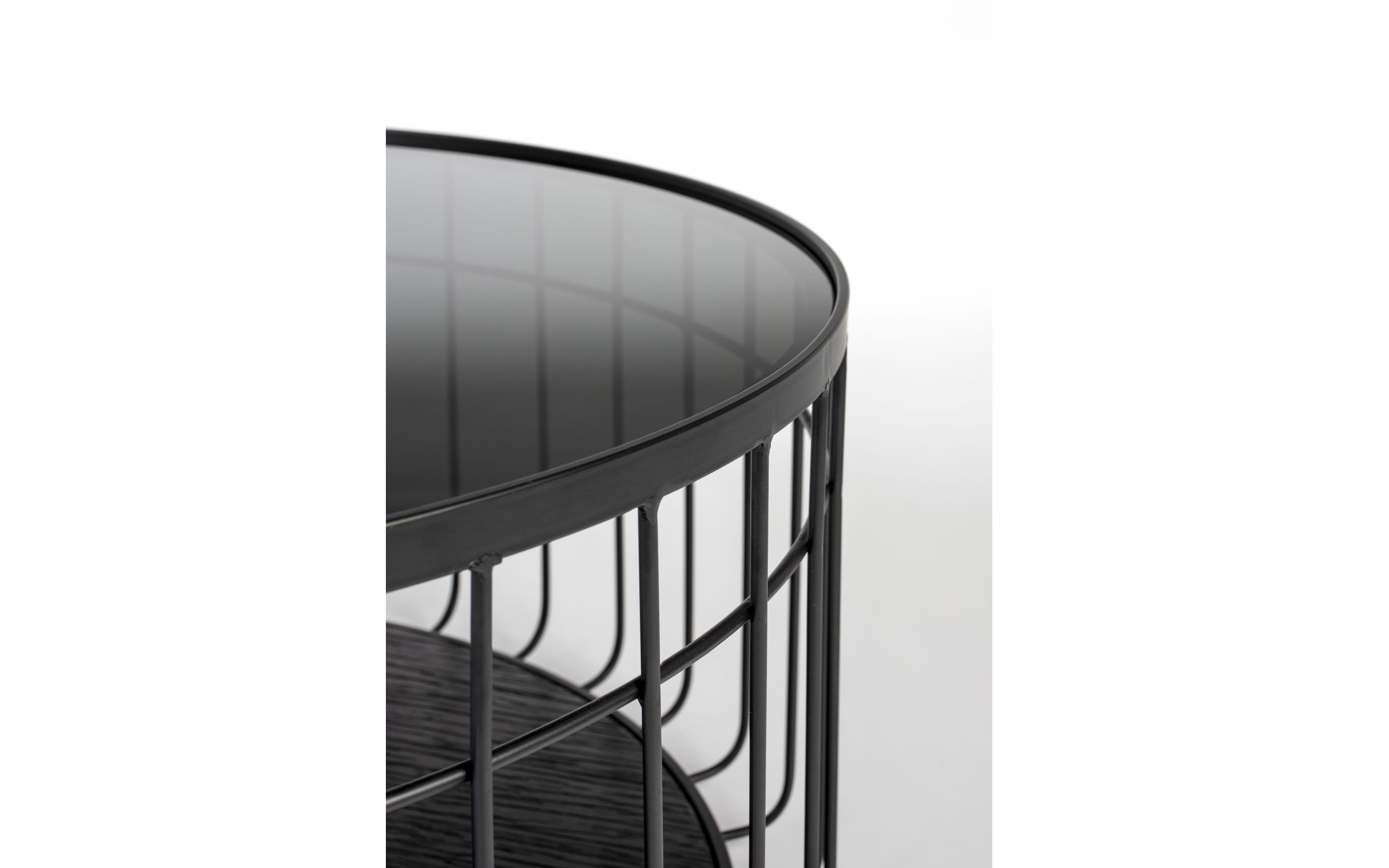 Ausführung der Tischplatte aus gehärtetem Glas in schwarz, Metallrahmen in schwarz pulverbeschichtet, MDF Bodenplatte mit Tannenholzfurnier in schwarz lackiert, Höhe ca. 38 cm, Durchmesser ca. 80 cm.