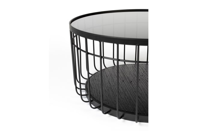 Ausführung der Tischplatte aus gehärtetem Glas in schwarz, Metallrahmen in schwarz pulverbeschichtet, MDF Bodenplatte mit Tannenholzfurnier in schwarz lackiert, Höhe ca. 31 cm, Durchmesser ca. 60 cm.