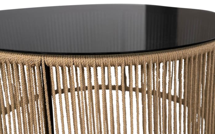 Ausführung der Tischplatte aus Sicherheitssglas in grau, Gestell aus Metall in schwarz mit Baumwollkordeln. Durchmesser ca. 75. Höhe ca. 40 cm.