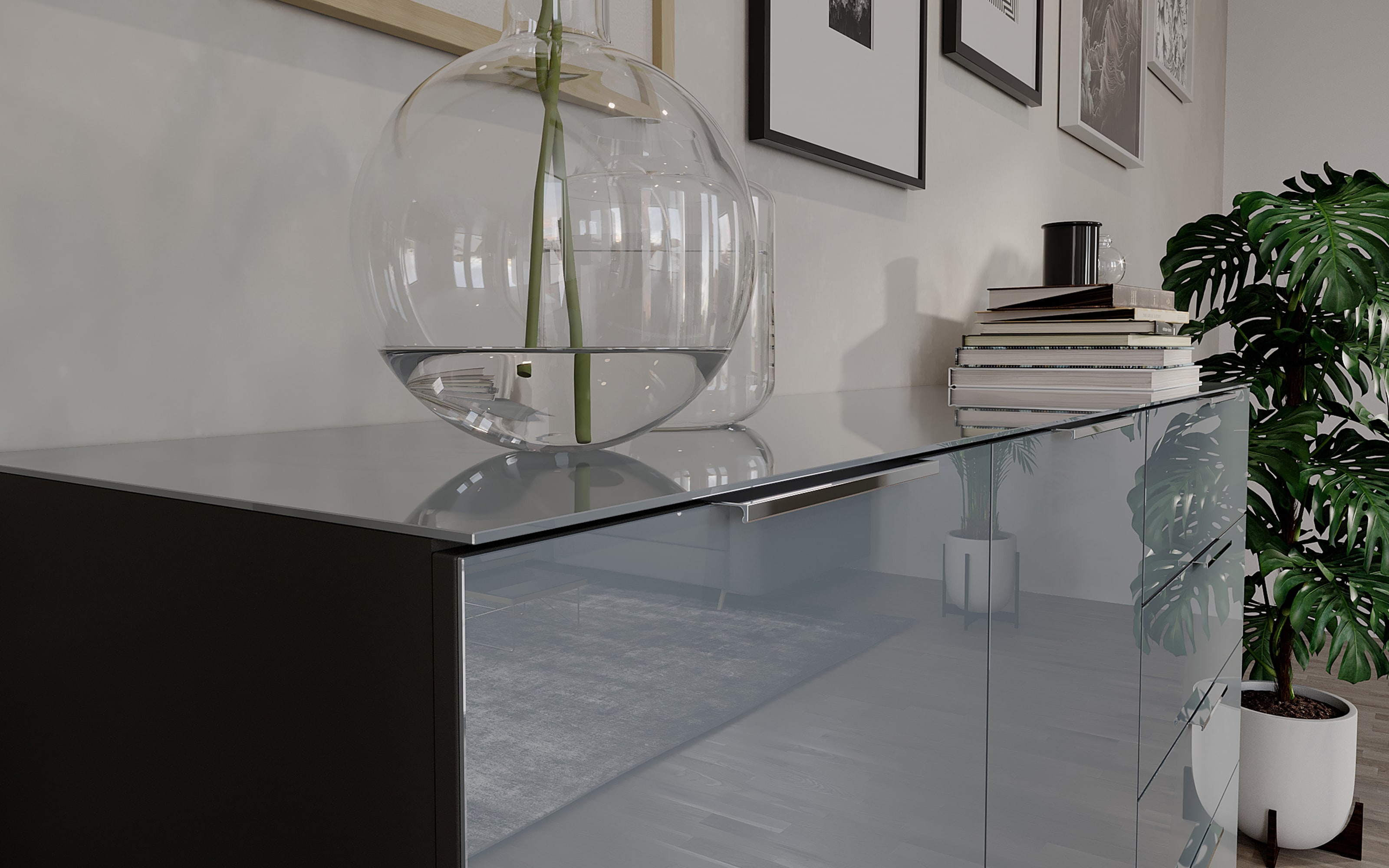 Ausführung mit Front aus Glas in silbergrau, Korpus in graphit mit Melaminharzbeschichtung, Auflage aus Einscheibensicherheitsglas in silbergrau, mit hoher Widerstandskraft,
