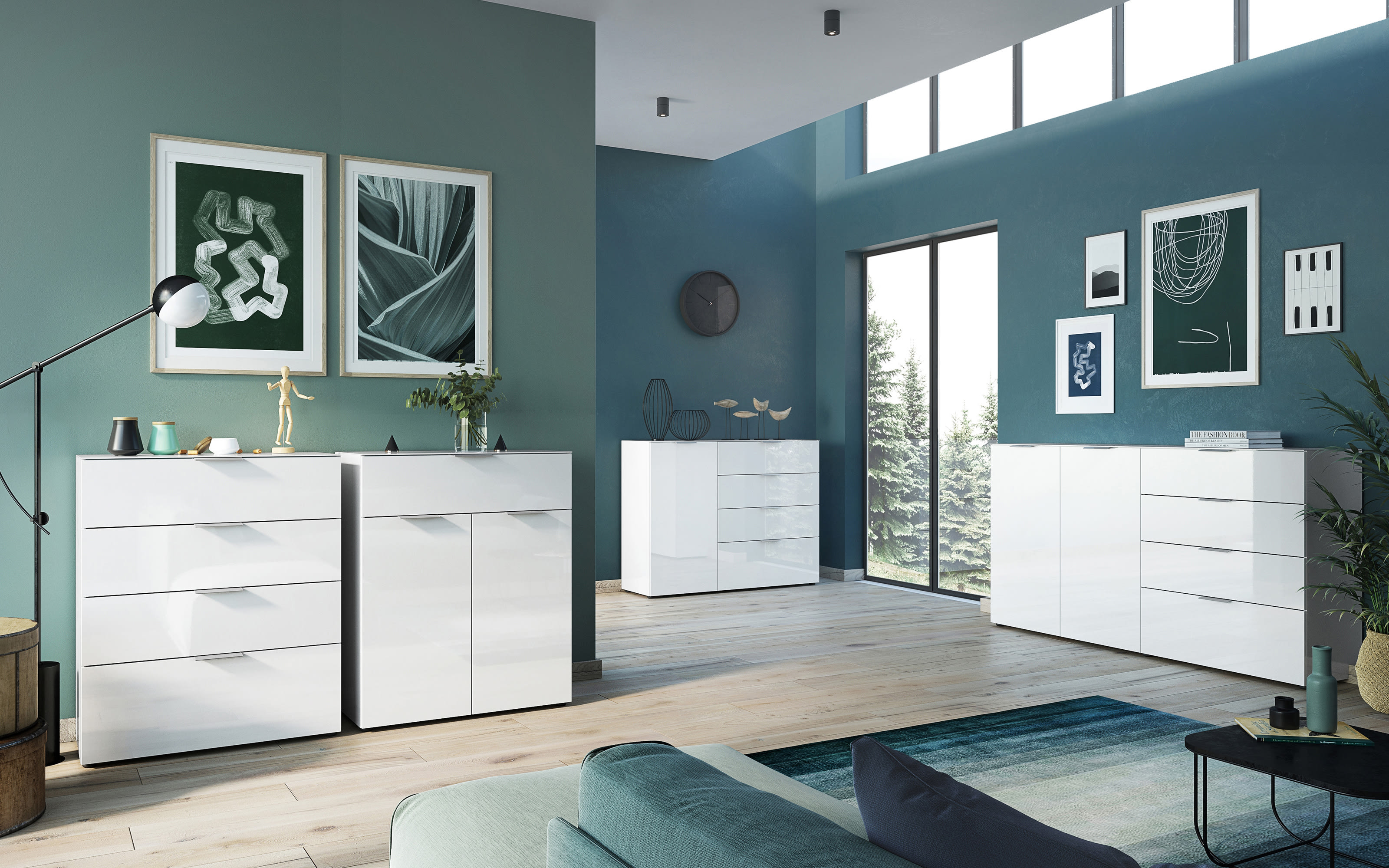 Ausführung mit Front aus Glas in weiß, Korpus in weiß mit Melaminharzbeschichtung, Auflage aus Einscheibensicherheitsglas, mit hoher Widerstandskraft,