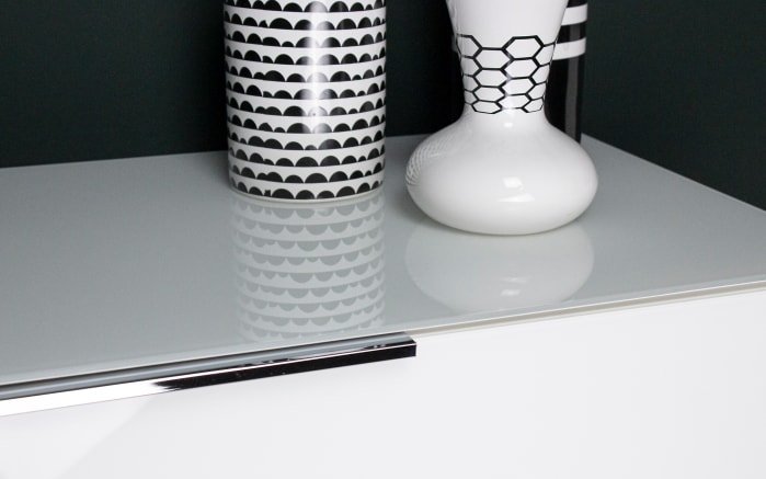Ausführung mit Front aus Glas in weiß, Korpus in weiß mit Melaminharzbeschichtung, Auflage aus Einscheibensicherheitsglas in weiß, mit hoher Widerstandskraft,