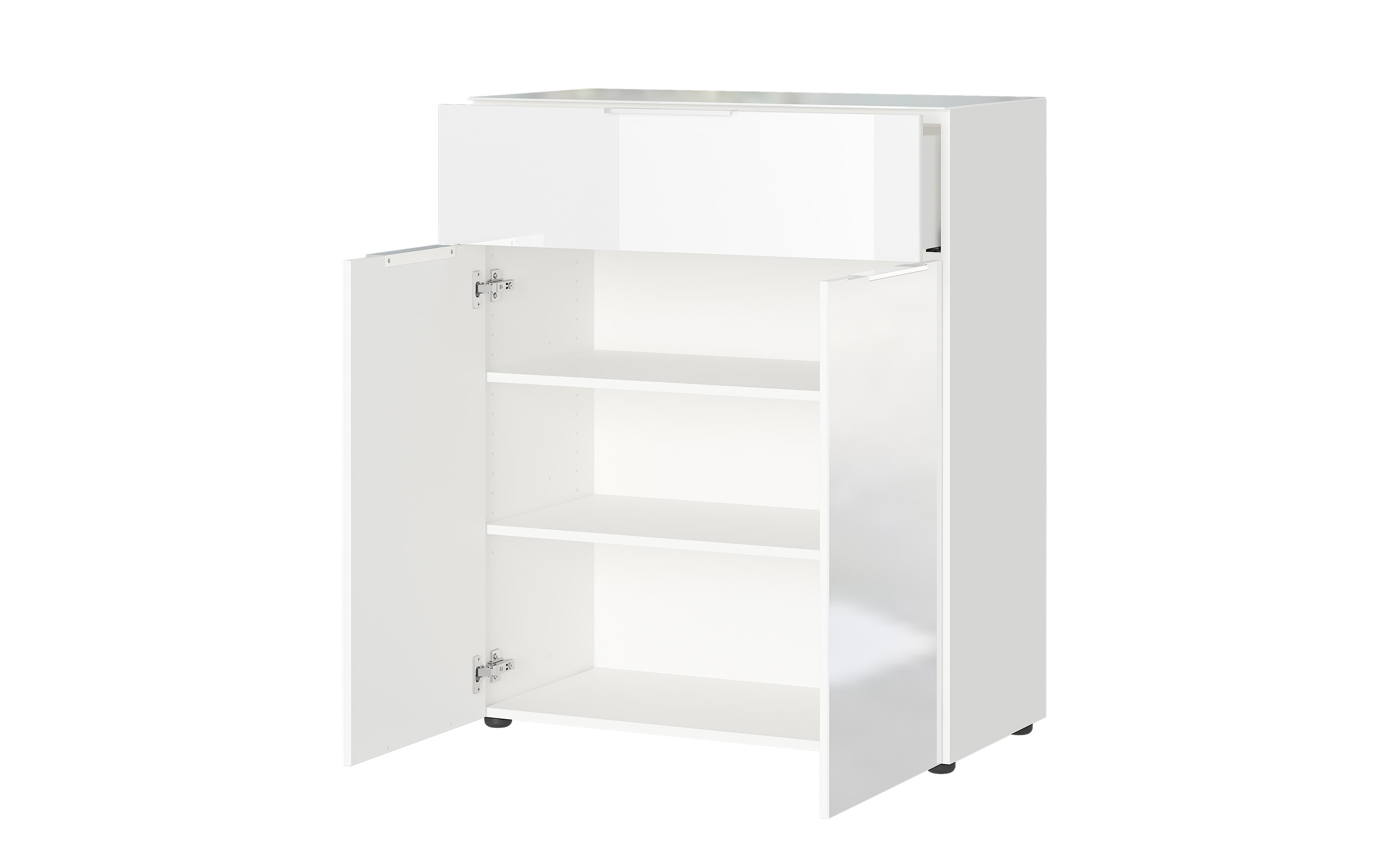 Ausführung mit Front aus Glas in weiß, Korpus in weiß mit Melaminharzbeschichtung, Auflage aus Einscheibensicherheitsglas, mit hoher Widerstandskraft,