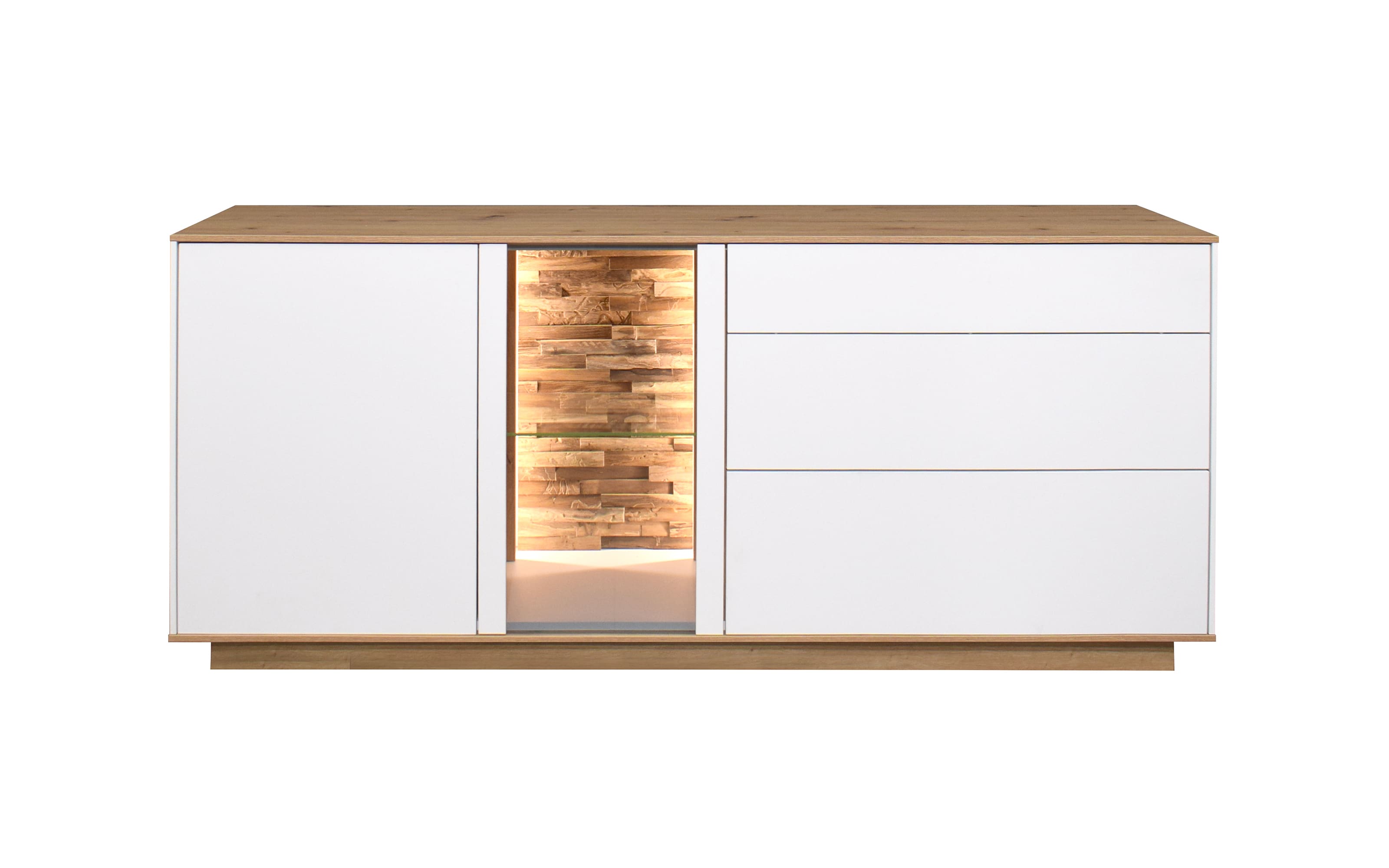 1 Glastür, Rückwand mit Holzapplikation inklusive LED Beleuchtung, 1 Tür, 1 Schubkasten mit Softclose Funktion, 1 Klappe, 1 Glaseinlegeboden,