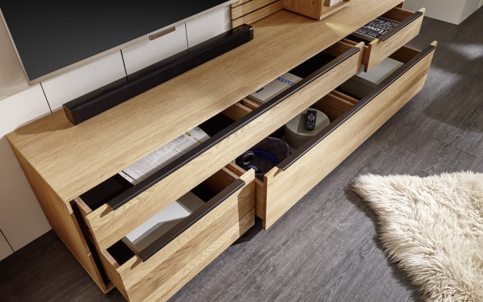 Ausführung der Front in Eiche massiv, Korpus furniert, 4 Schubkästen mit Softclose Funktion, B/H/T ca. 210 x 51 x 45 cm.