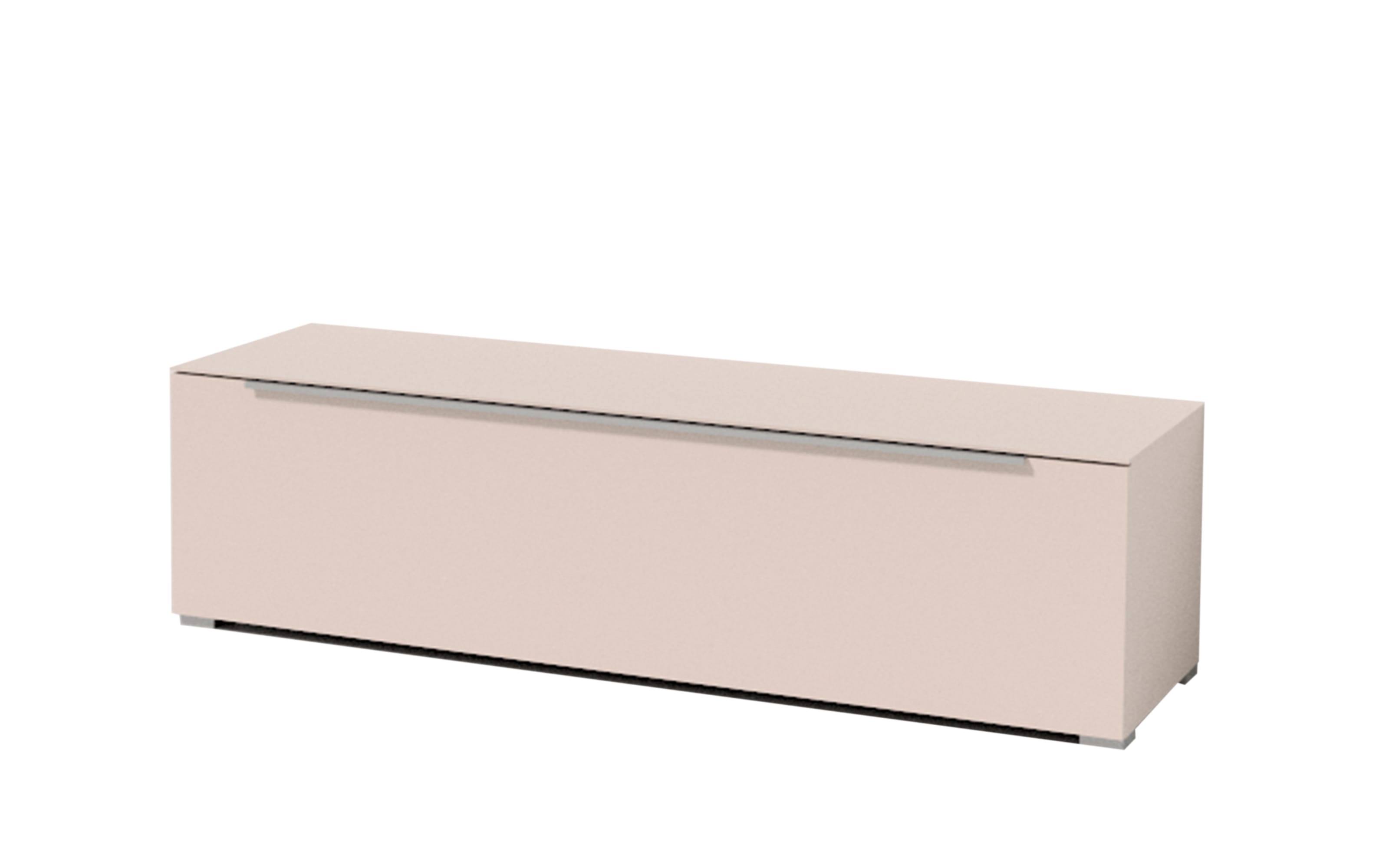 Ausführung mit Front und Korpus in Sandfarbig, matt, 6 mm Glastop, Antifingerprint, 1 Klappfach, 2 Einlegeböden,