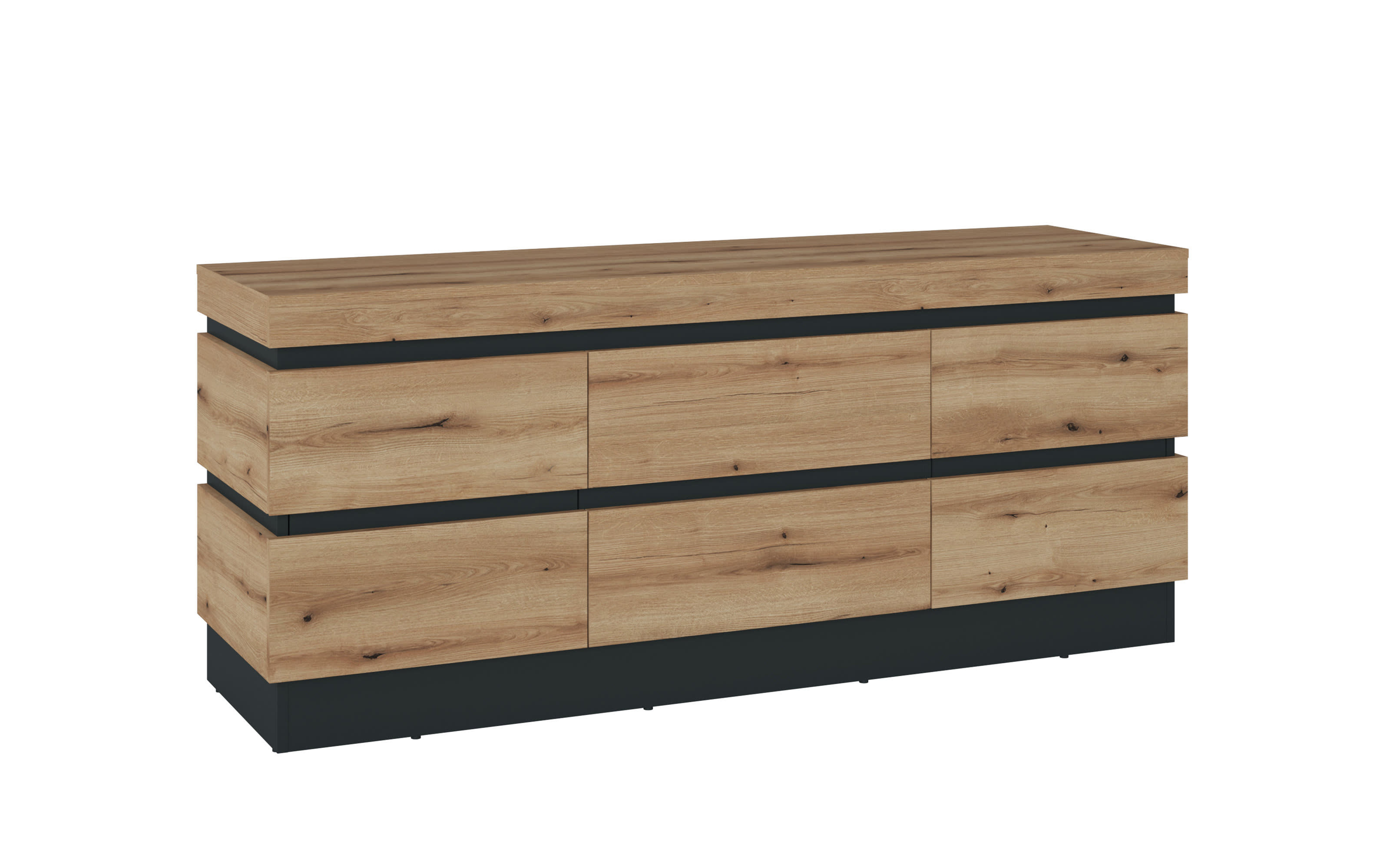 Ausführung mit Korpus und Front in Eiche Coast Evoke Nachbildung mit Absetzung und Rückwand in Kosmos grau, grifflos da Push-to-Open Funktion,