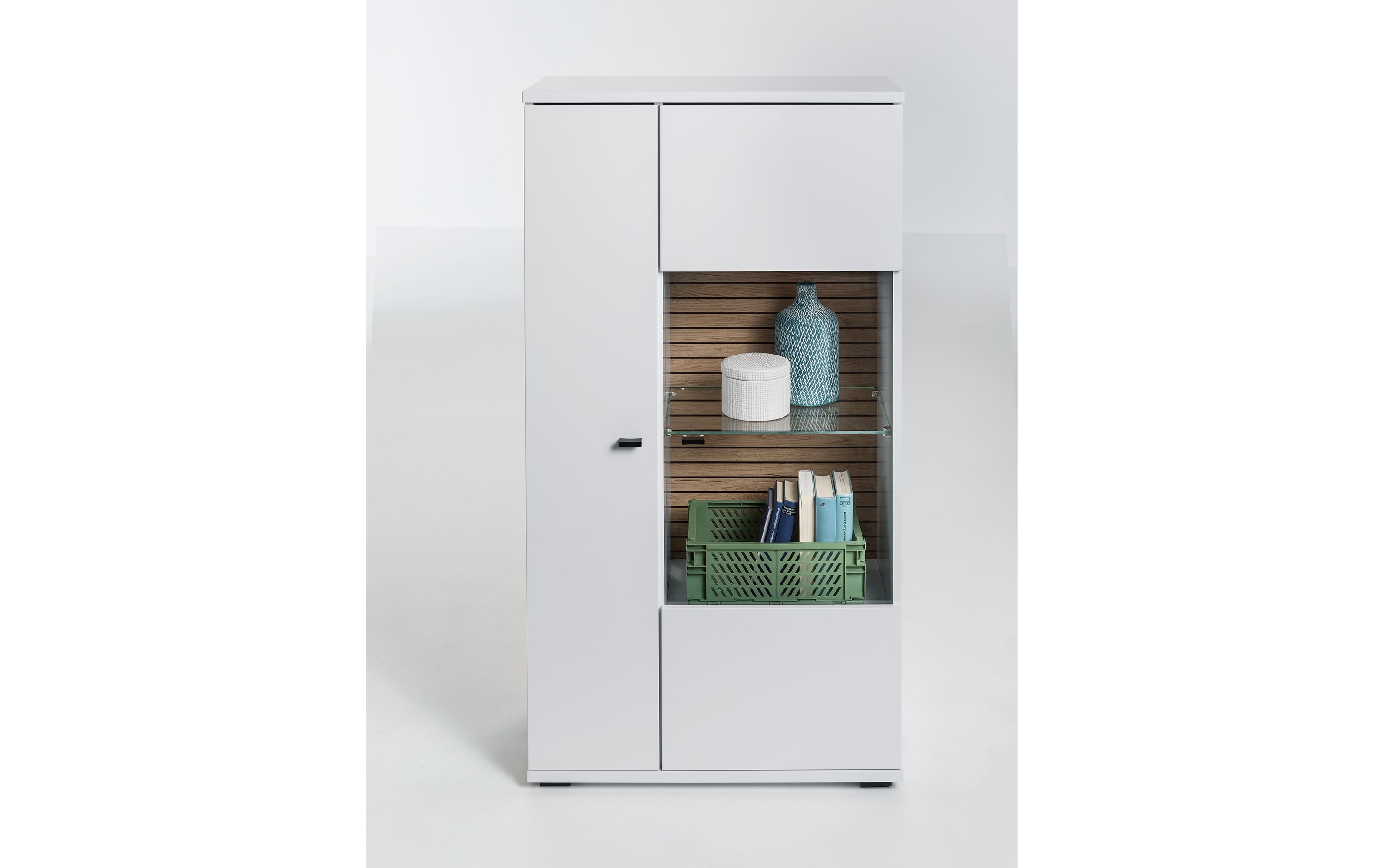 Ausführung mit Front und Korpus in weiß, Rückwand in Nox Eiche-Nachbildung, stripes, 2 Türen davon eine mit Glaseinsatz, 1 Glaseinlegeboden, Füße und Griffe aus Kunststoff in schwarz,