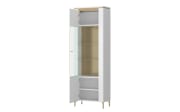 Moderne Vitrine mit Front und Korpus aus MDF, Spanplatte melaminbeschichtet, PVC Folie in Alpinweiß, Hochglanz, Absetzung und Rückwand in Goldfarbig, ABS-Kanten,