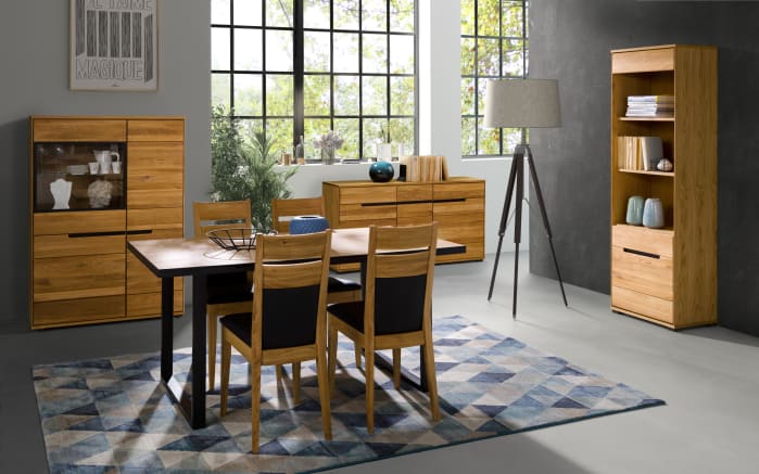 Ausführung der Front aus massiver Eiche, Korpus furniert, 3 Holztüren, 1 Glastür,