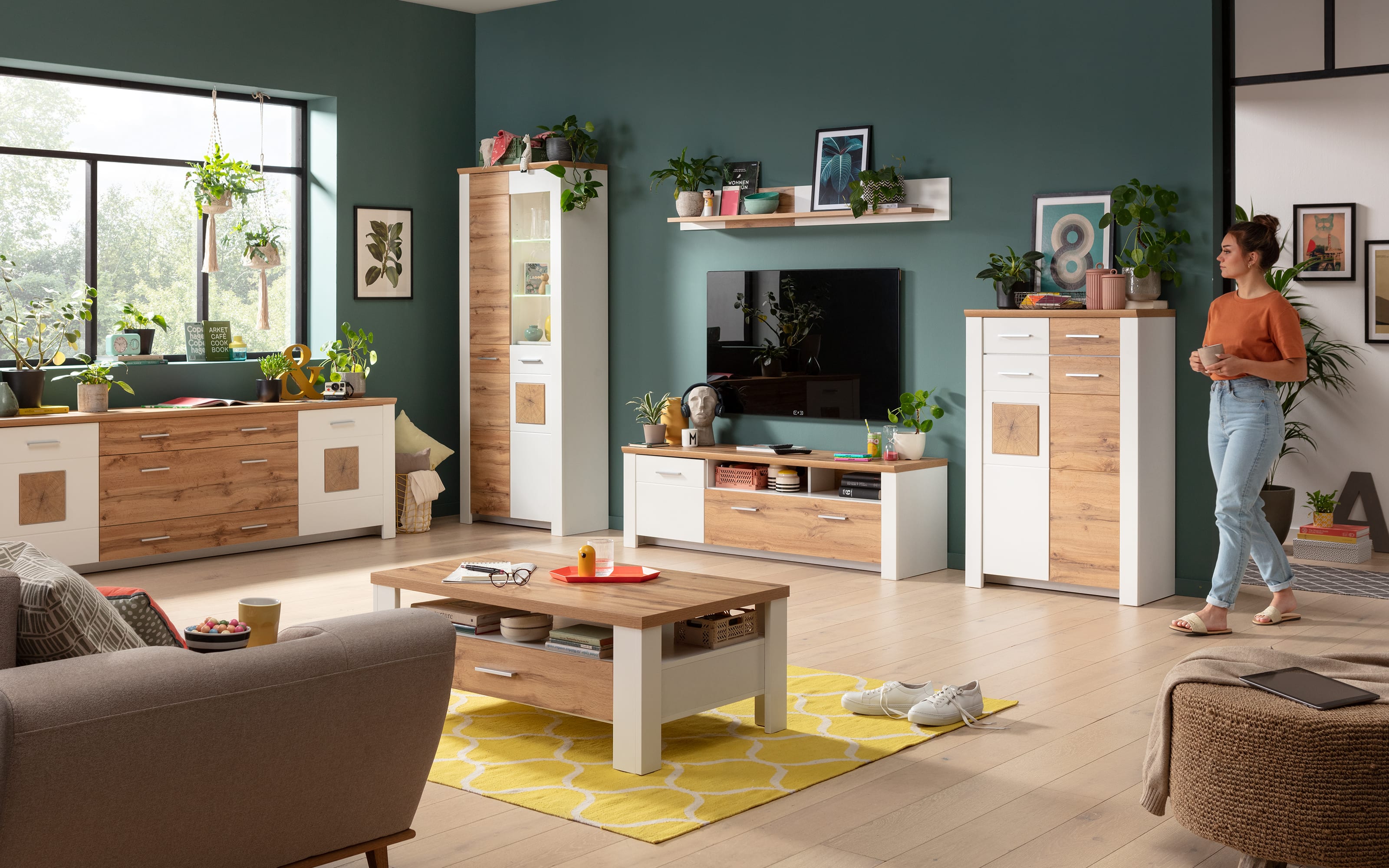 Vitrine Matera, weiß/Altholz-Nachbildung, 2-türig, inkl. LED-Beleuchtung