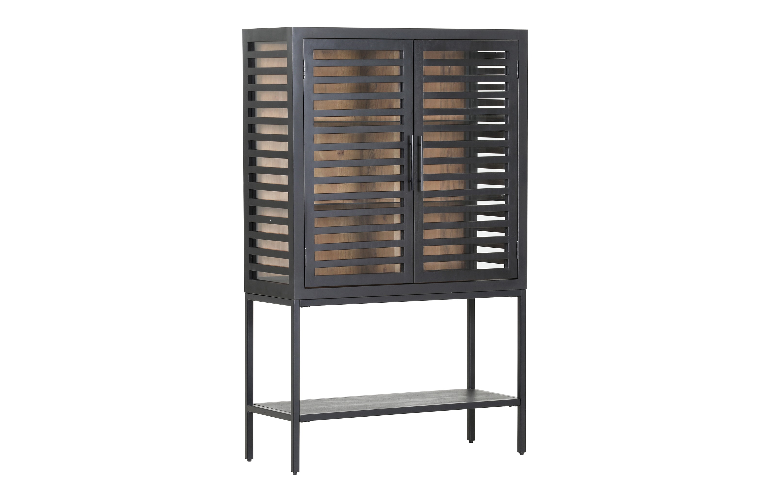 stabiles Fußgestell aus Metall in Schwarz lackiert, zusätzliche Ablagefläche, 2 Glastüren mit 2 durchgehenden Glaseinlegeböden. Erzeugt durch die Lamellen und das Licht