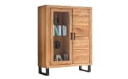 Ausführung in Eiche teilmassiv geölt, Füße aus Metall in schwarz, 1 Glas-Holztür, 1 Holztür, B/H/T ca. 110 x 140 x 40 cm.