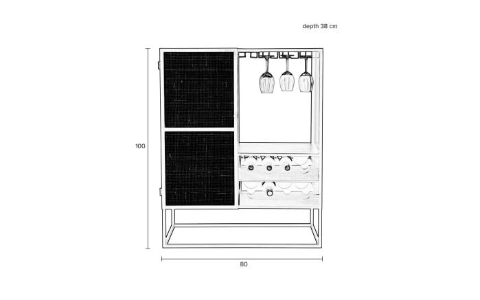 Ausführung mit Korpus und Front aus MDF in schwarz lackiert, 1 Tür aus Rattangeflecht, 2 Regale mit Ablageflächen für 8 Weinflaschen, inklusive Vorrichtung für Weingläser, Gestell aus Eisen in schwarz,