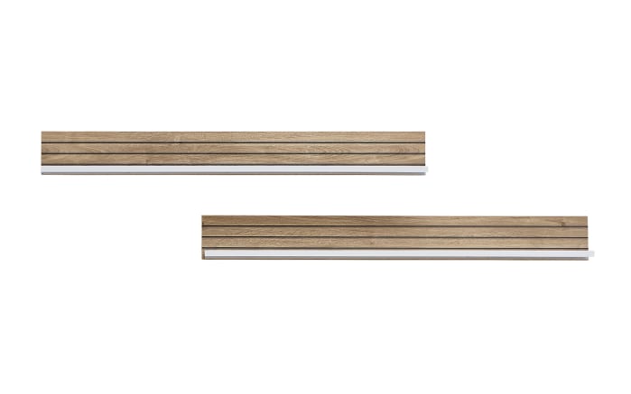 Ausführung in Weiß matt, Absetzung in Eiche-Nachbildung, B/H/T ca. 140 x 16 x 20 cm.