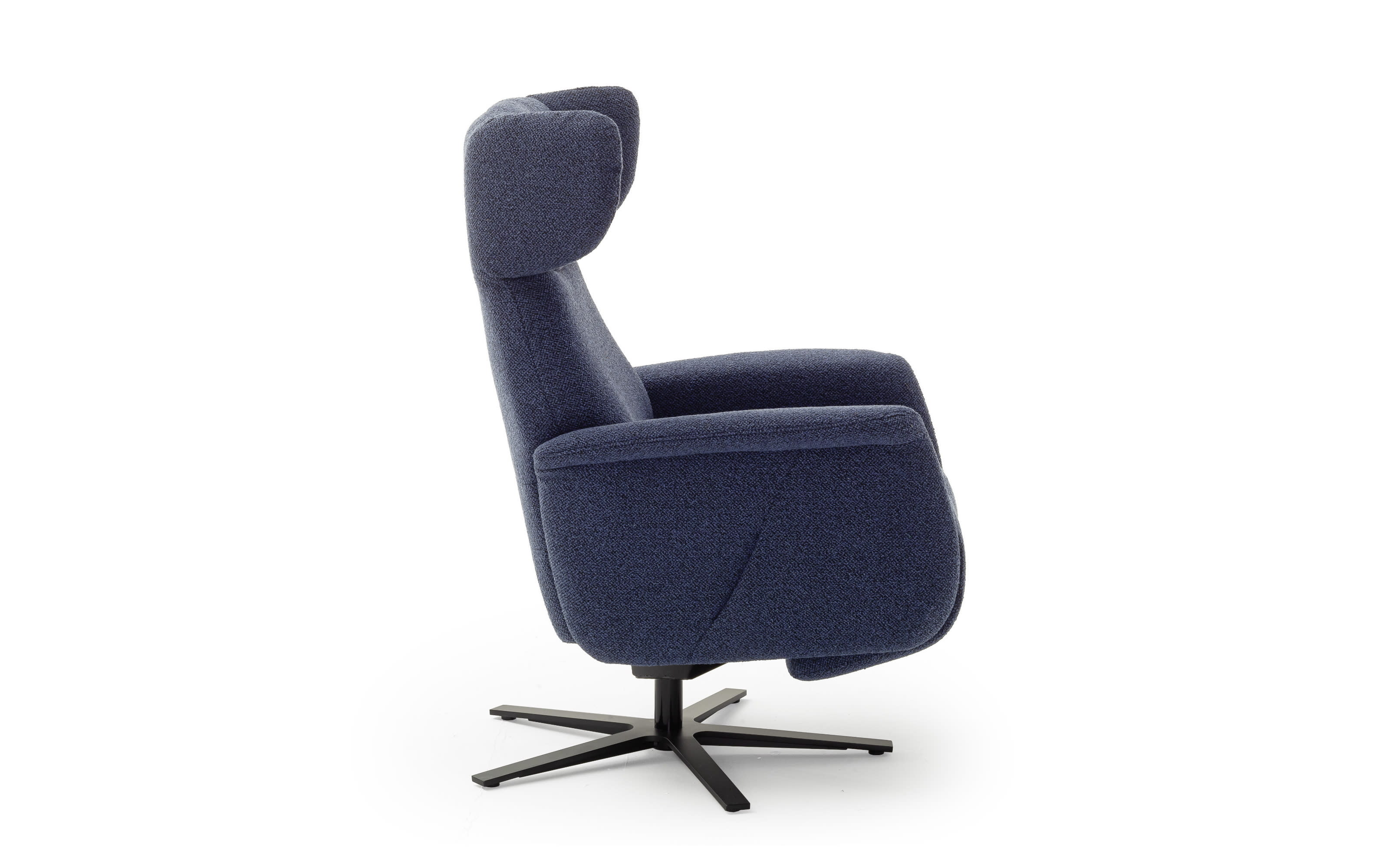 Ergonomisch geformter Relaxsessel mit Drehfunktion, Stoffbezug in Space Navy, komfortable PUR Schaumpolsterung auf Stahlwellen Federn, Drehteller mit Sternfuß aus Metall in Schwarz matt,