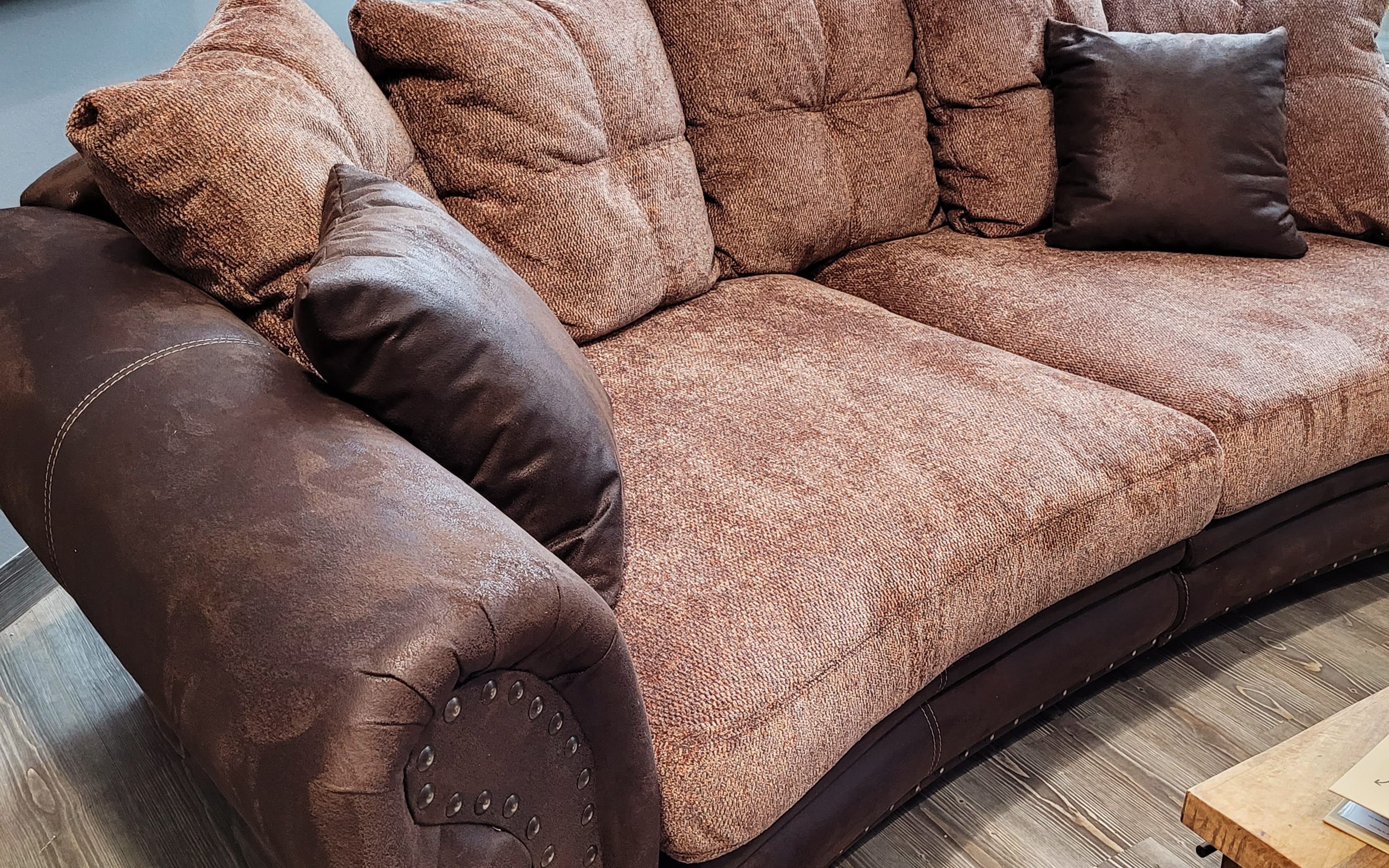 Rustikales Megasofa mit Außenbezug aus Leder in Dunkelbraun, Innenbezug aus Grobstoff in Brauntönen, Ziernaht in beige, Chatosen mit Nagelung, Holzgrundgestell, Federkern auf Wellenunterfederung,
