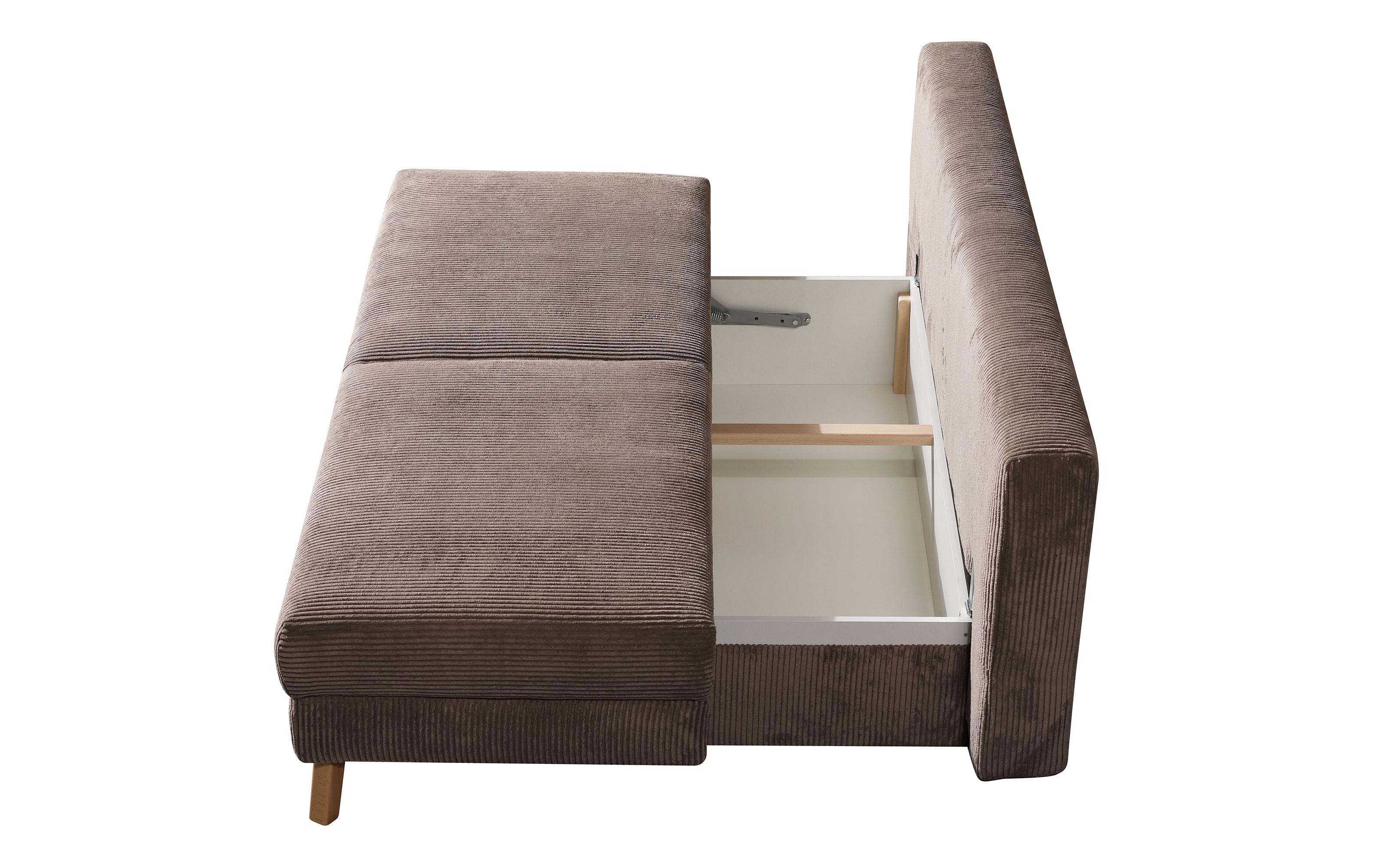 Ausführung in Stoffbezug 55-6571, Cord braun, mit Rücken- und Armlehnkissen, inklusive geräumiger Bettkasten.