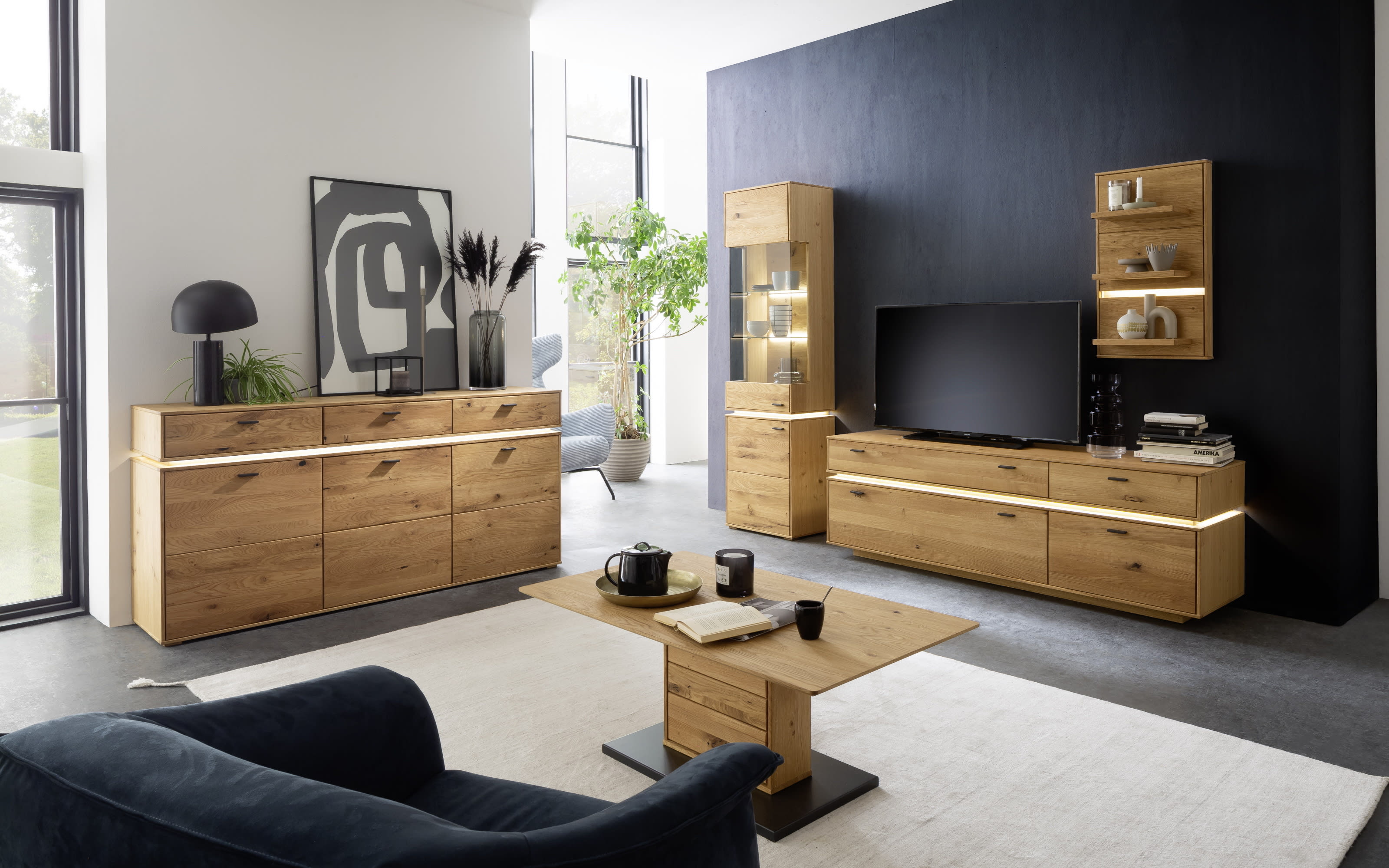 Wohnwand Como, Wildeiche geölt massiv, inklusive Korpusbeleuchtung