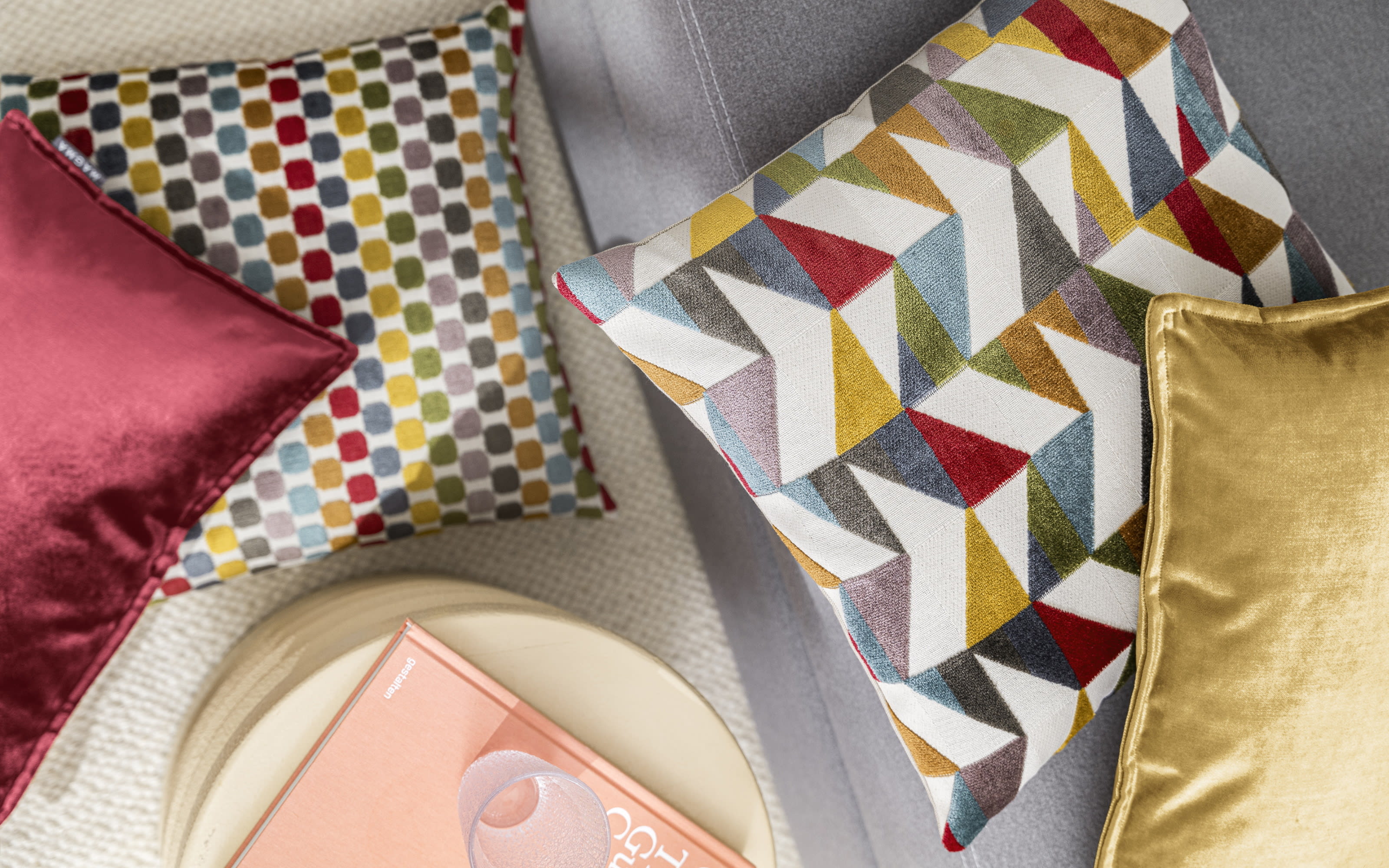 Die Kissenhülle hat auf der Vorderseite bunte Punkte mit einer samtig weichen Oberfläche.